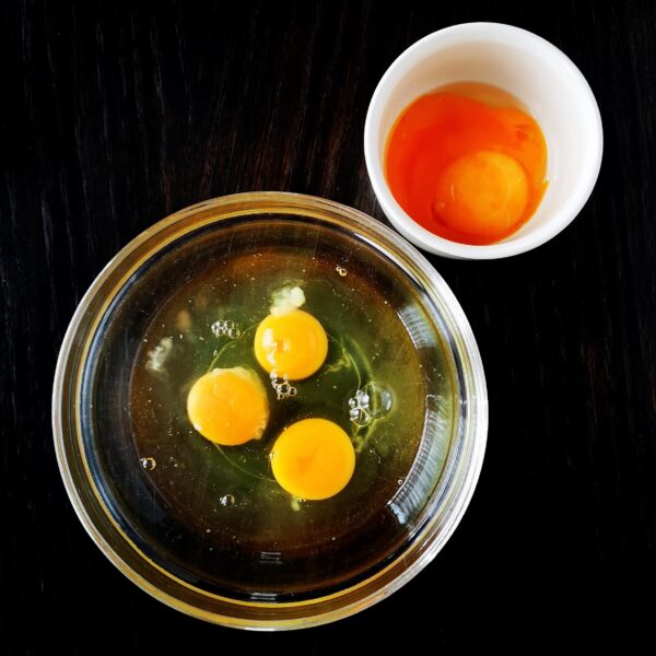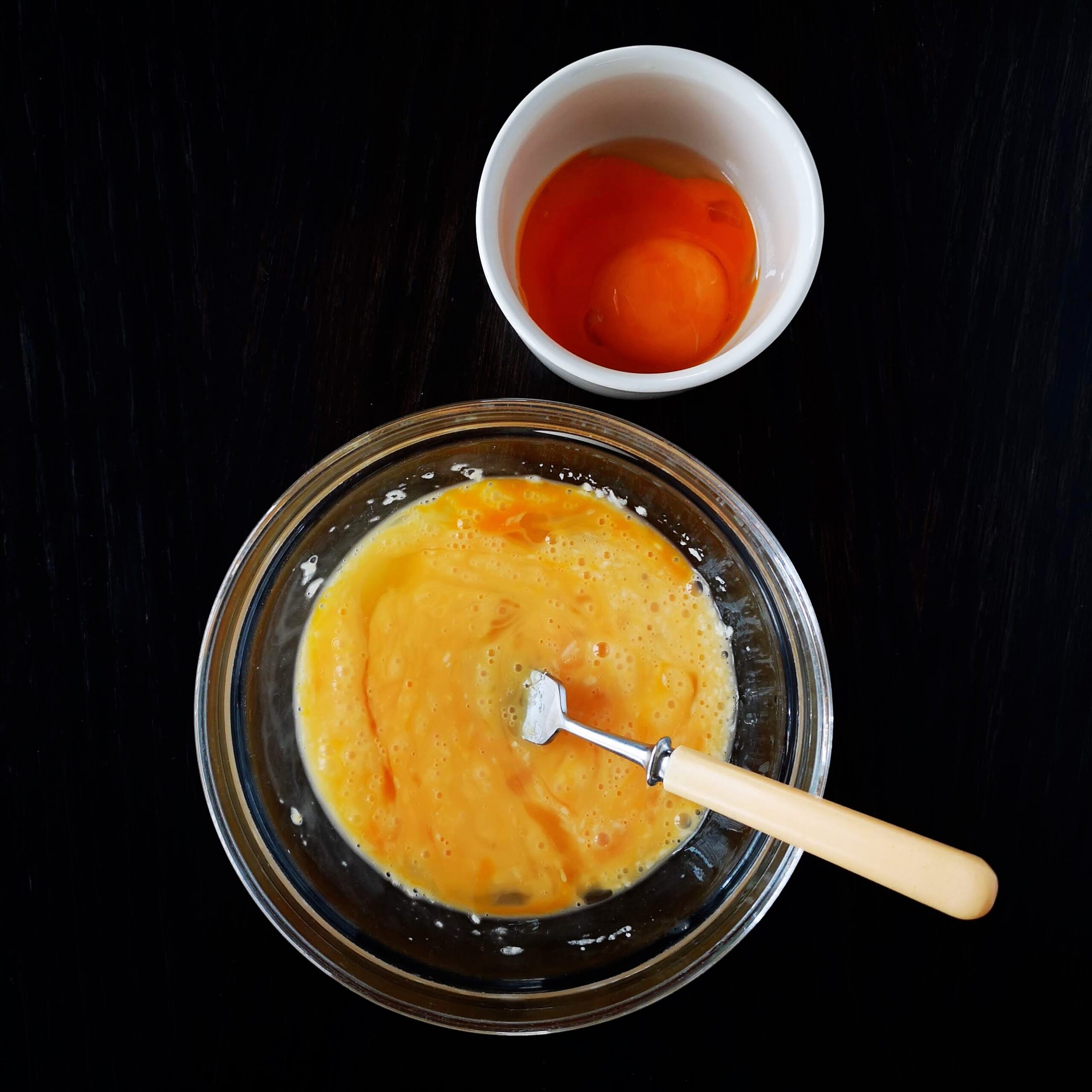 Загрейте мазнината в тиган на умерена температура. Отделете 2 от жълтиците и ги запазете.