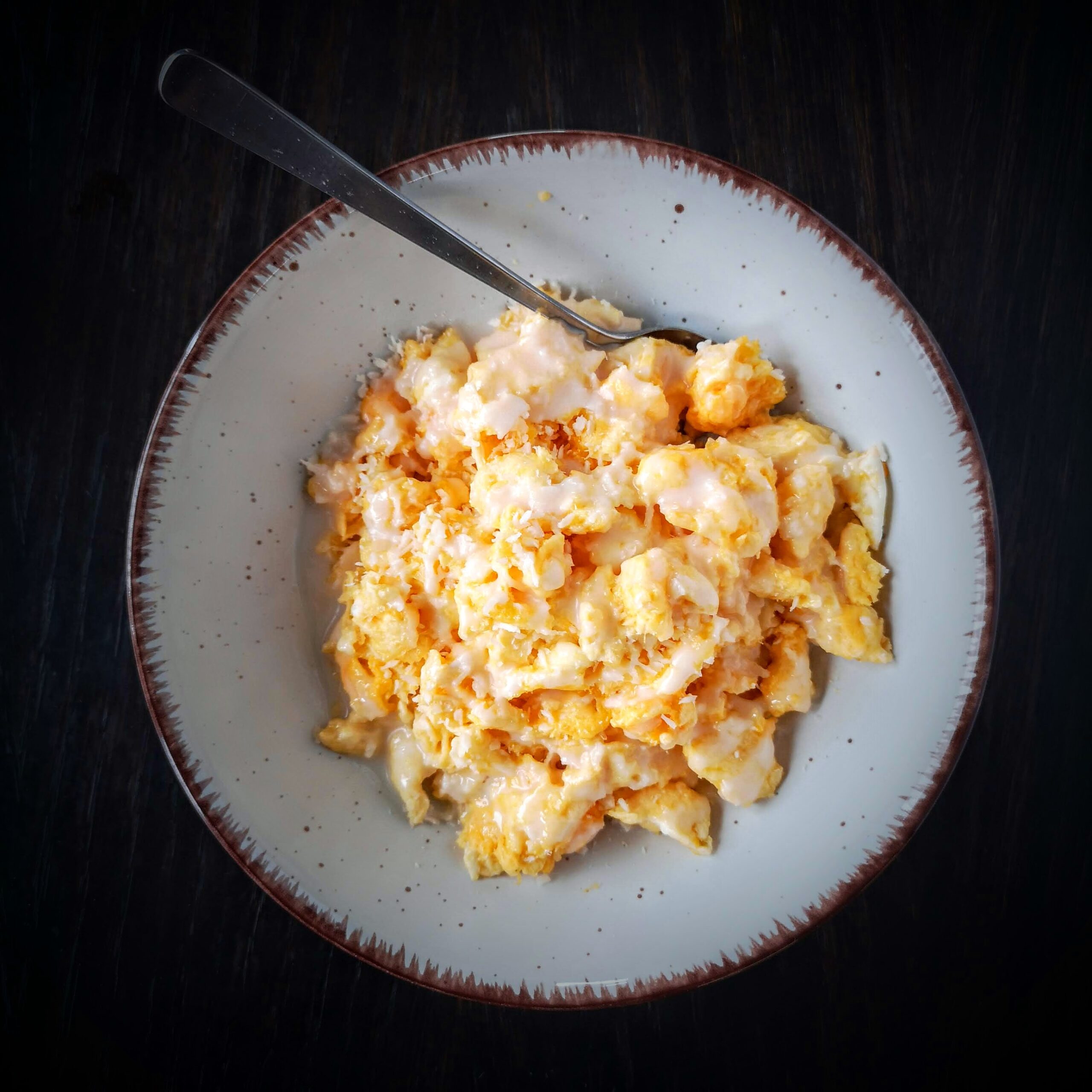 Сервирайте бърканите яйца топли, като полеете със щедра лъжица кокосов крем за неустоим аромат и вкус.