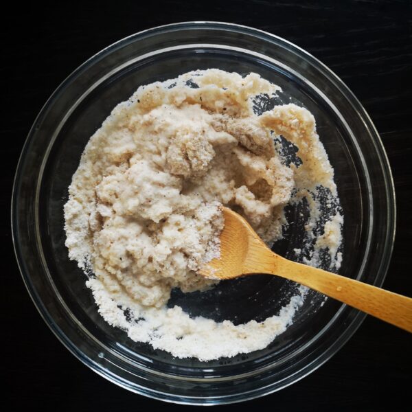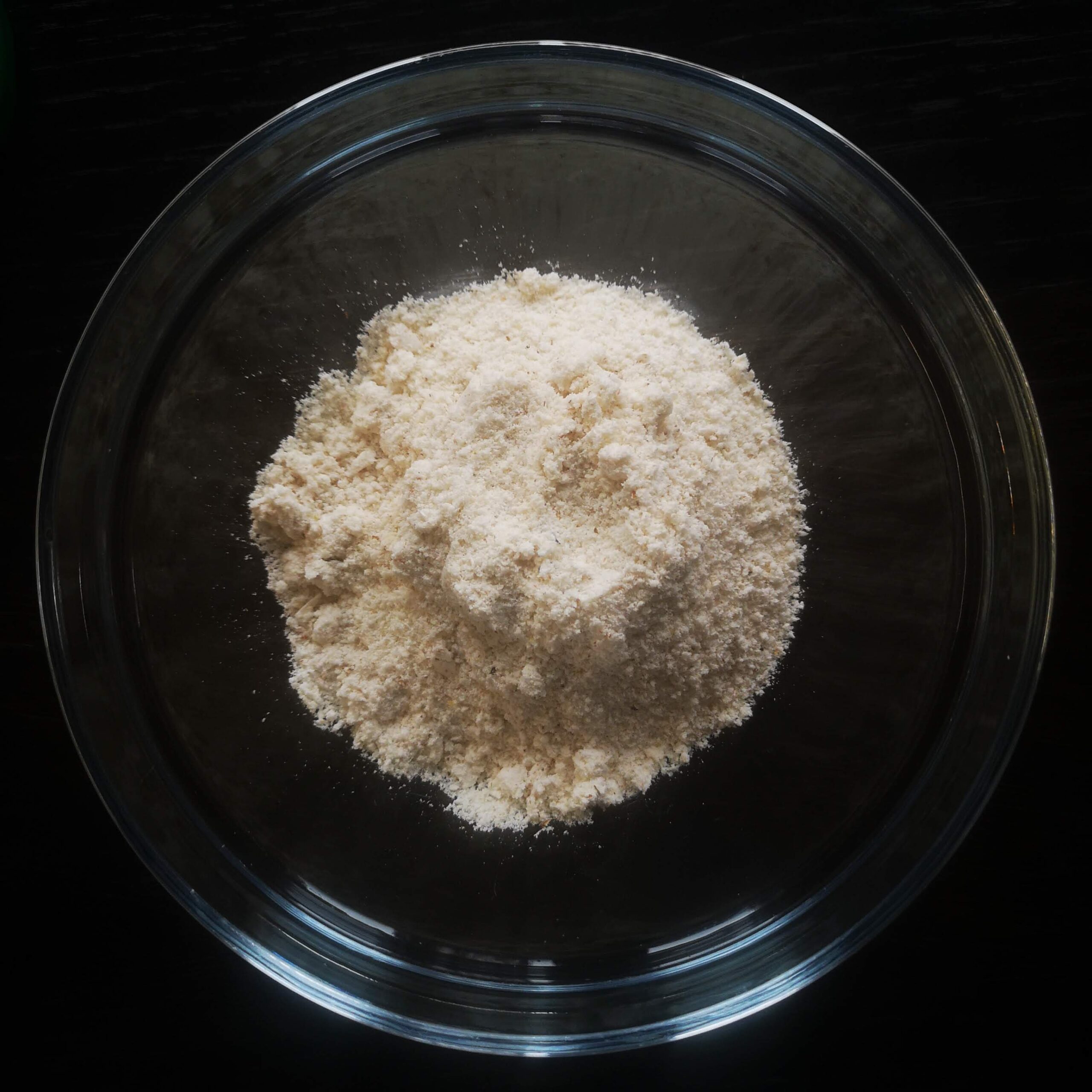 Смесете сухите съставки.20 г кокосово брашно, 20 г бадемово брашно, 10 г псилиум хуск, 1/2 ч. л. бакпулвер, 1 к. л. хималайска сол, 20 г нишесте от тапиока