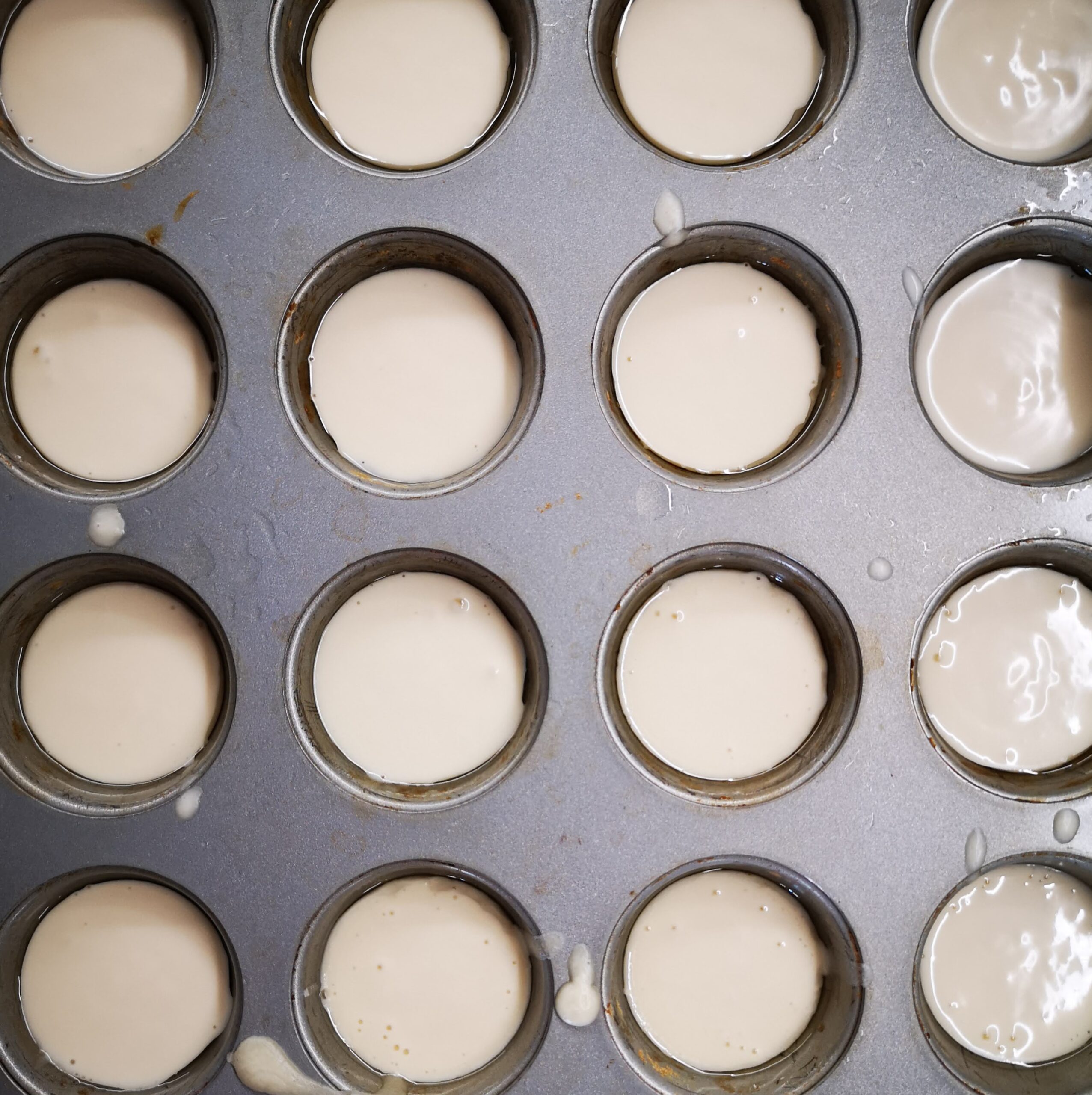 Намаслете форми за мини мъфини с мазнината. Разпределете сместа в 24 гнезда, като изпълните само 3/4 от обема на гнездото.10 г МАСЛО ГХИ
