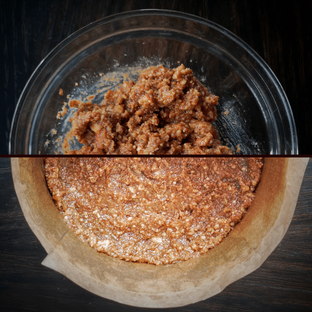 Смелете продуктите за основата в блендер с няколко пулсации. Смесете трохите с топлото топено масло. Разпределете равномерно в дъното на формата за печене, покрита с хартия за печене. Печете до златисто, около 10 минути.150 г орехи, 40 г масло, 20 г еритритол, 1 ч. л. канела на прах
