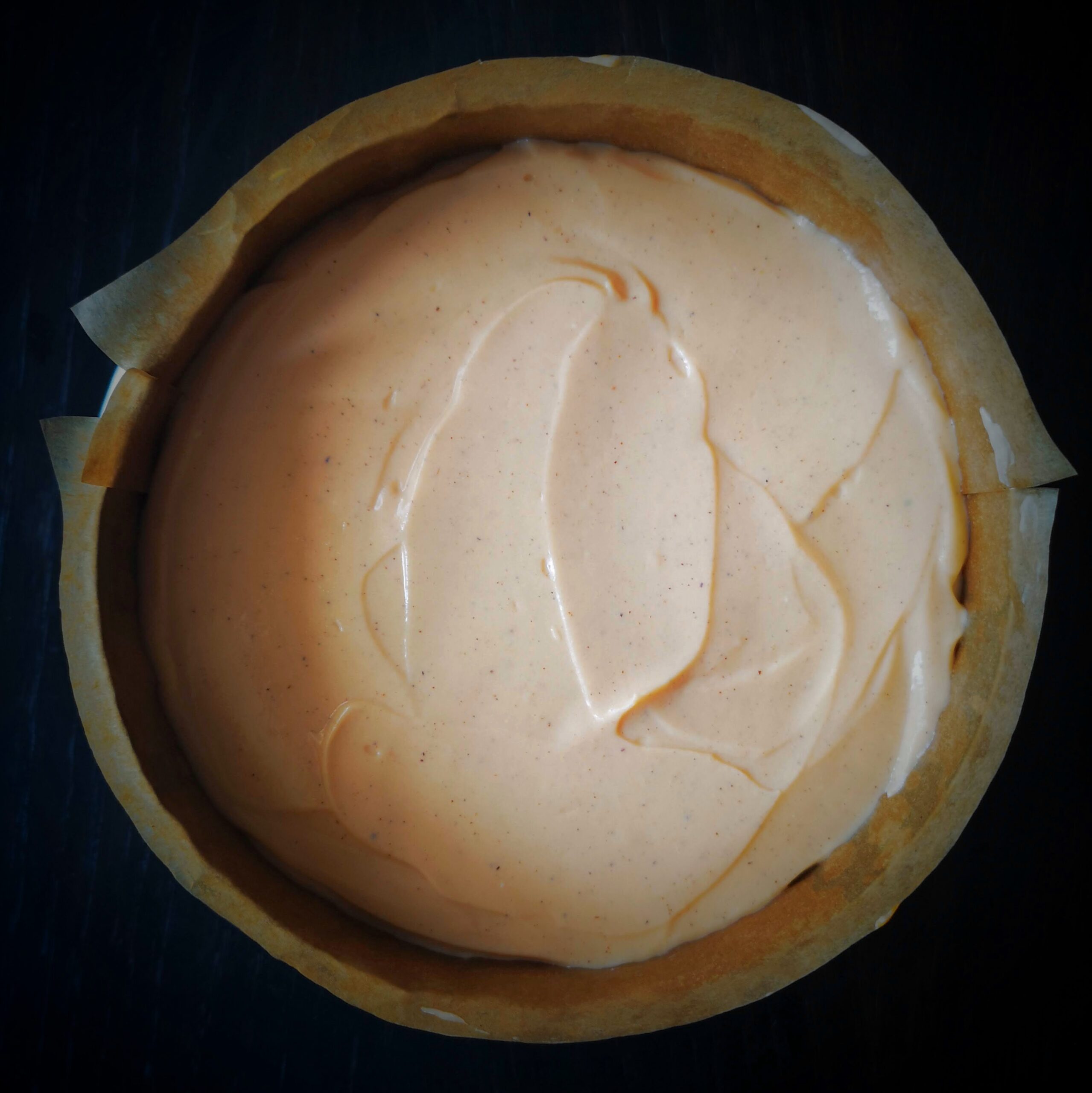 Блендирайте продуктите за пълнежа до гладкост. Излейте върху изпечената основа и загладете (ако формата за печене е с падащо дъно я поставете в още един съд за печене, за да се избегнете замърсяване във фурната). Върнете във фурната и печете 45 минути, докато горната част ще започне леко да потъмнява.500 г извара, 200 г пюре от тиква, 4 бр. яйца, 2 ч. л. подправки, 50 г еритритол