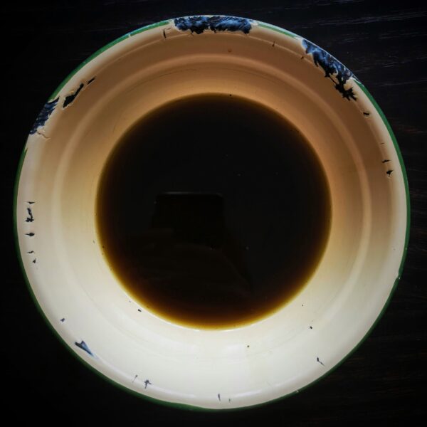 Изцедете внимателно цялата течност и прехвърлете в тенджерка. Течността ще бъде тъмно зелена до кафява на цвят. Загрейте леко на ниска температура в продължение на 15 минути. Целта е да се изпари алкохола и течността леко да се редуцира, без течността да завира. НЕ се вари!