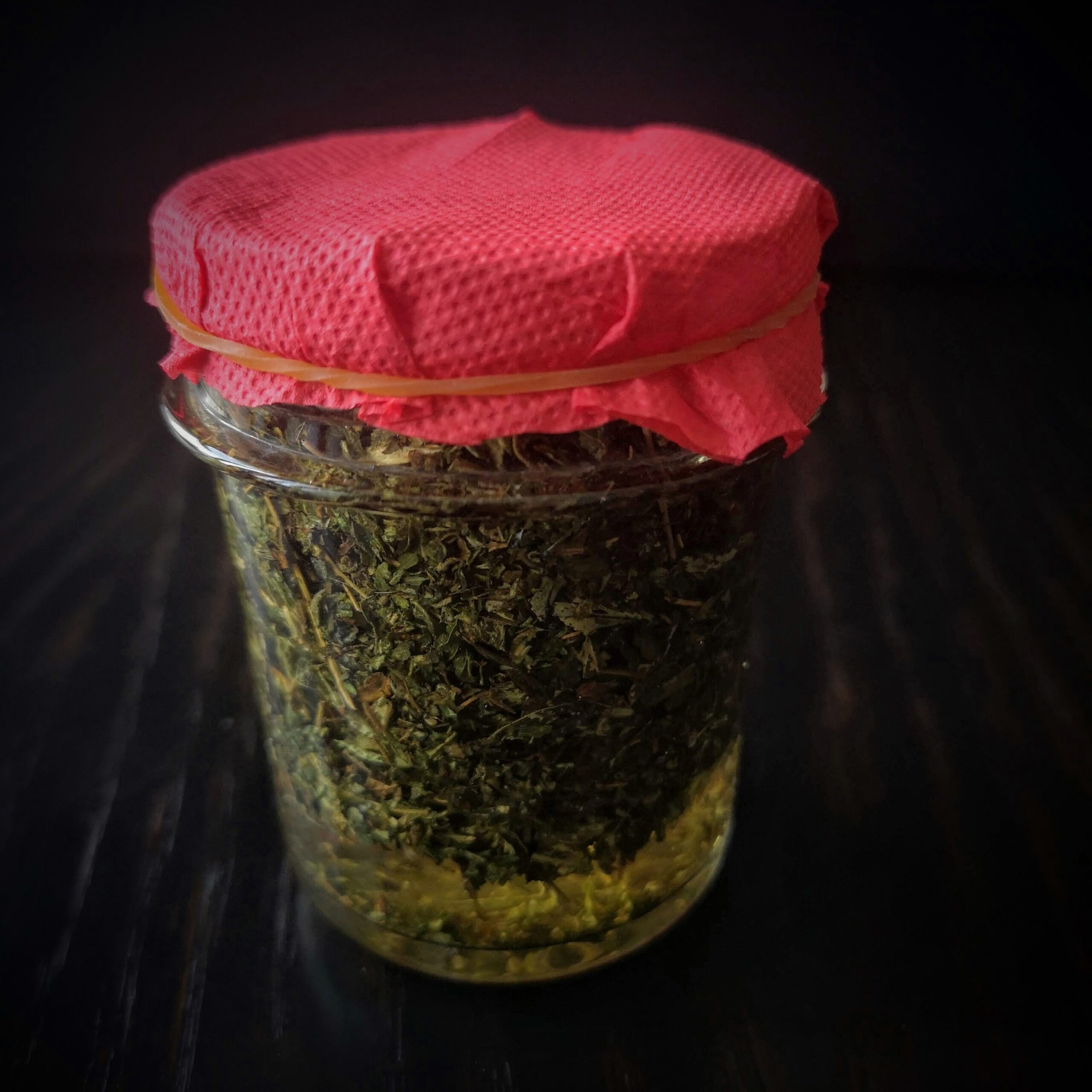 Залейте с водка, нека листата бъдат напълно потопени и накиснати. Покрийте гърлото на буркана със салфетка. Нека престои 40 часа.150 мл водка
