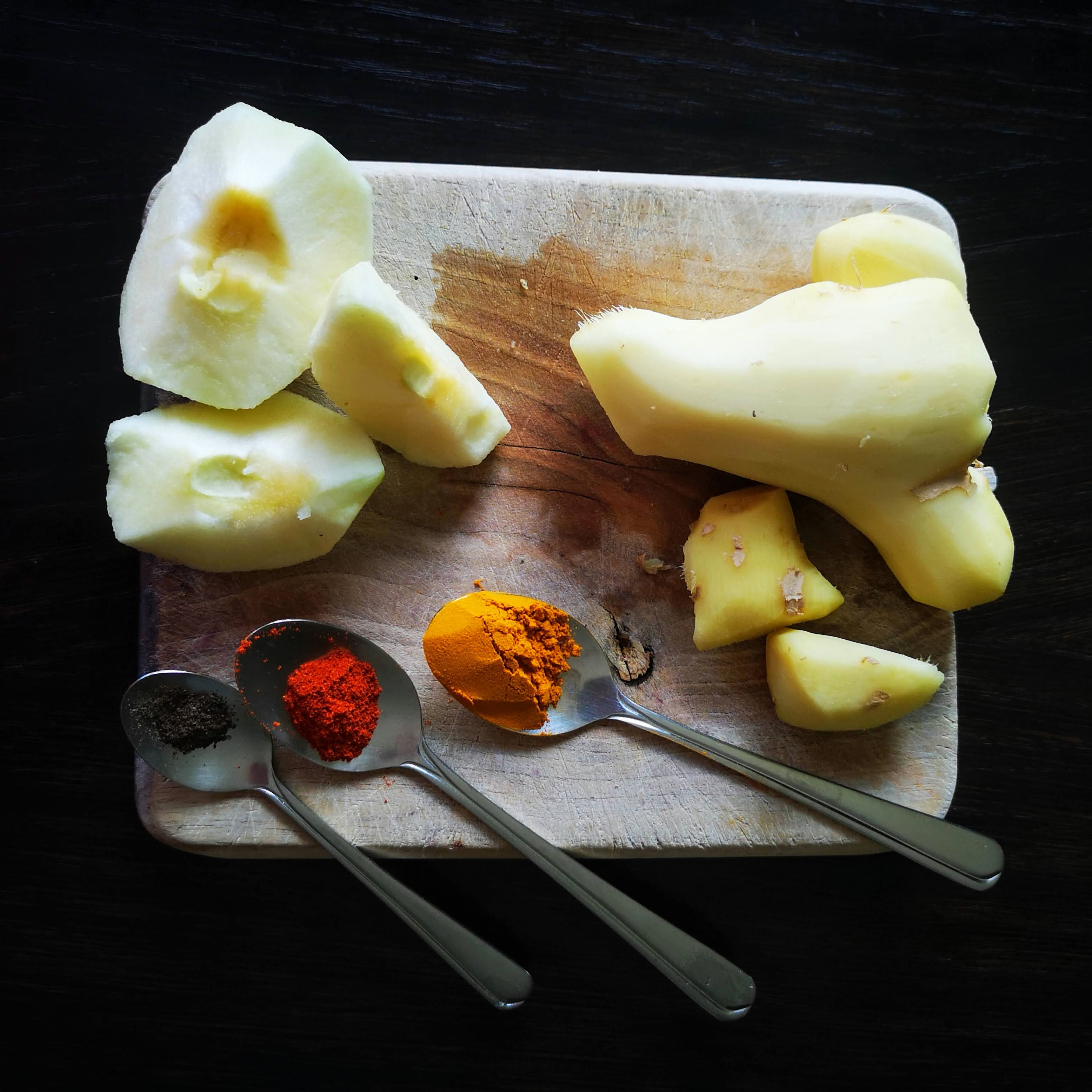 Комбинирайте всички съставки в блендер или кухненски робот и блендирайте до гладко пюре.150 г пресен корен джинджифил, 60 г ябълка, 1 ч. л. куркума, 1/4 ч. л. кайенски пипер, 1 щипка черен пипер, 240 мл вода