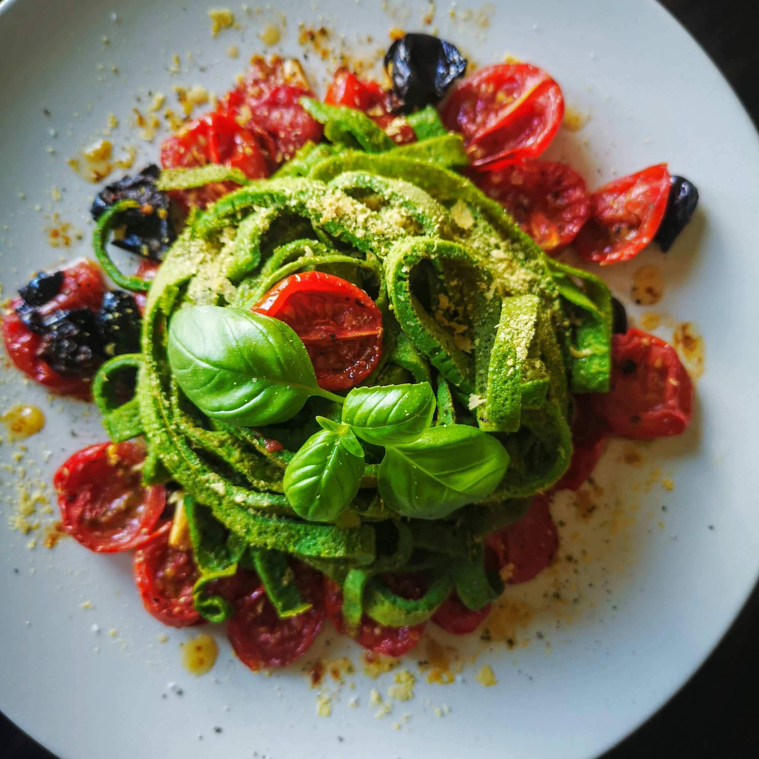 Сервирайте пастата върху канапе от изпечени доматки. За финал полейте със струйка зехтин и поръсете с хранителна мая.