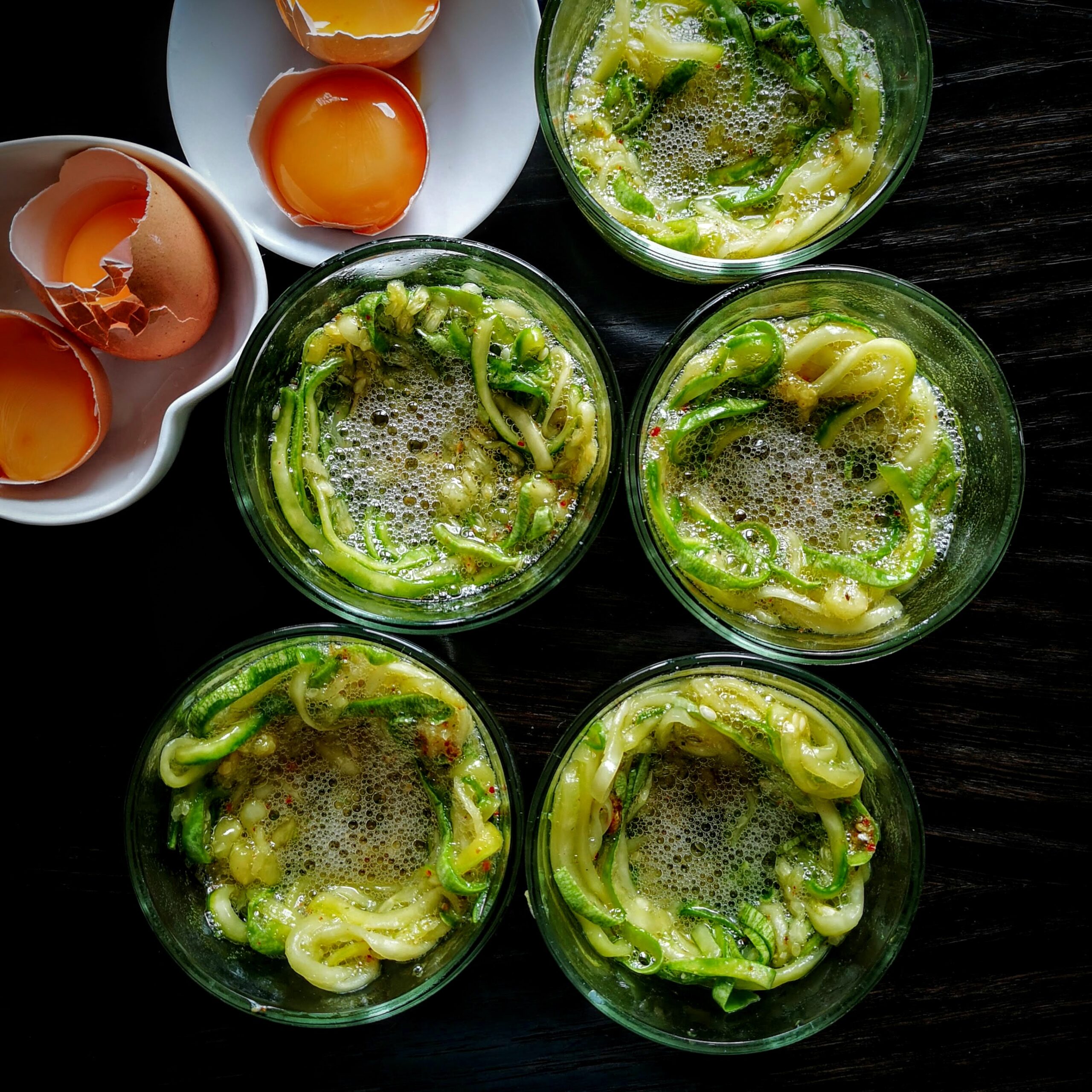 Следващата стъпка е отделянето на жълтъка от белтъците, след което белтъците се смесват с тиквичките. Използват се само половината от белтъците, за да не се разводнява излишно сместа. Останалите белтъци може да бъдат замразени и съхранени за друга рецепта.