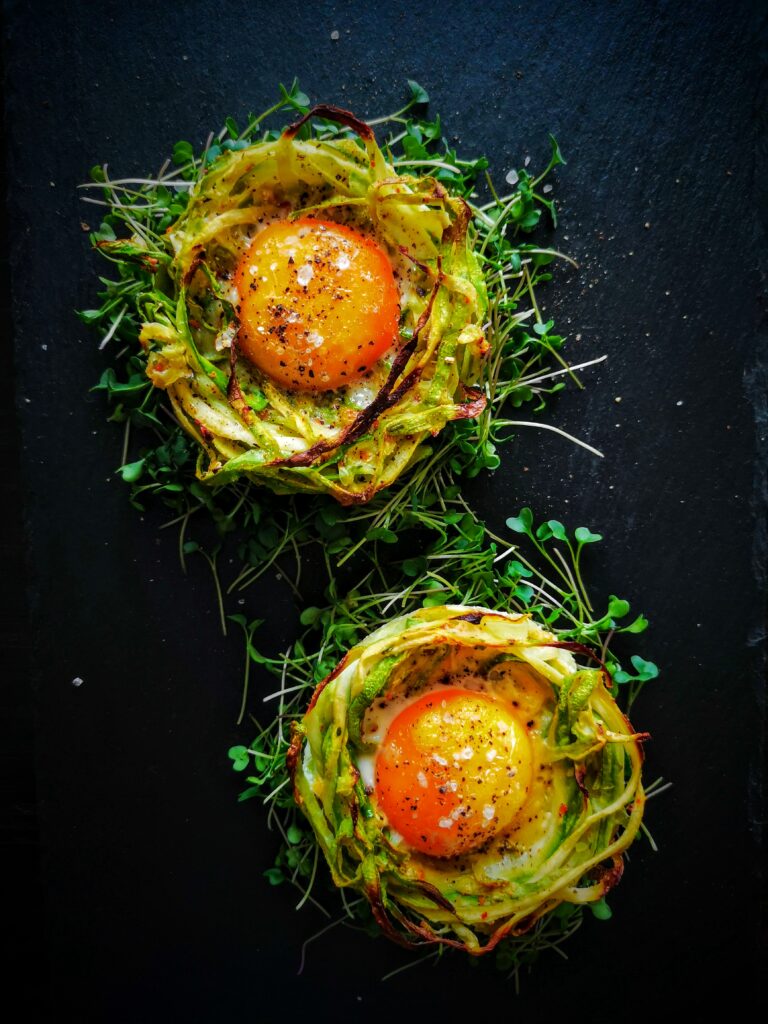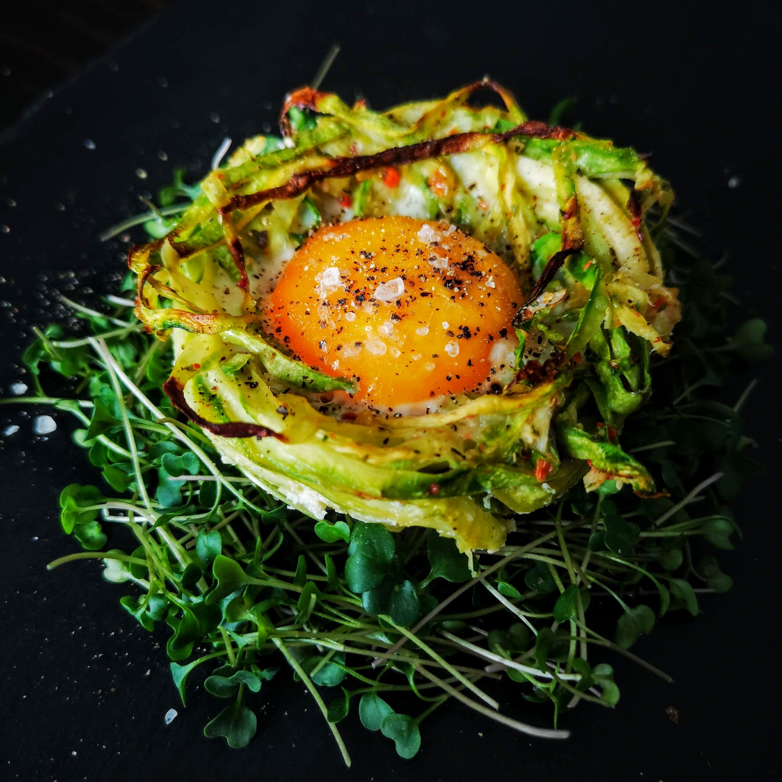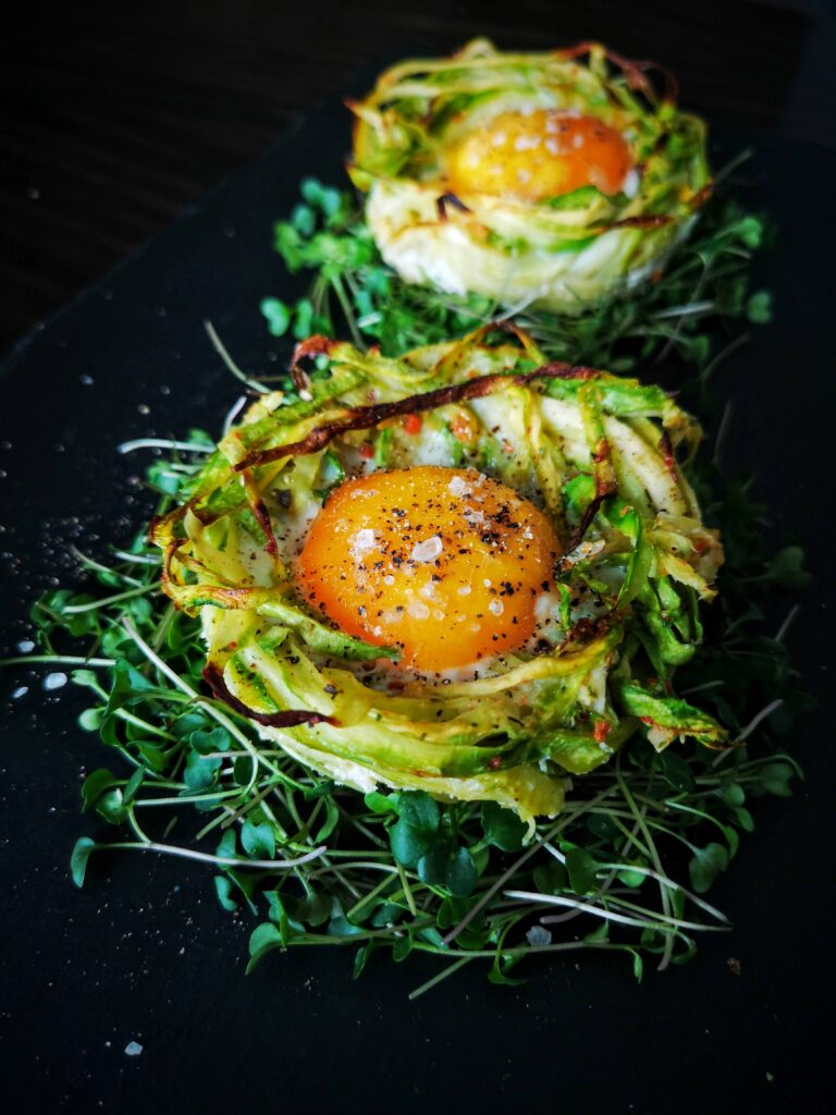 Гнезда от тиквички, зеленчуково ястие поднесено модерно и атрактивно.