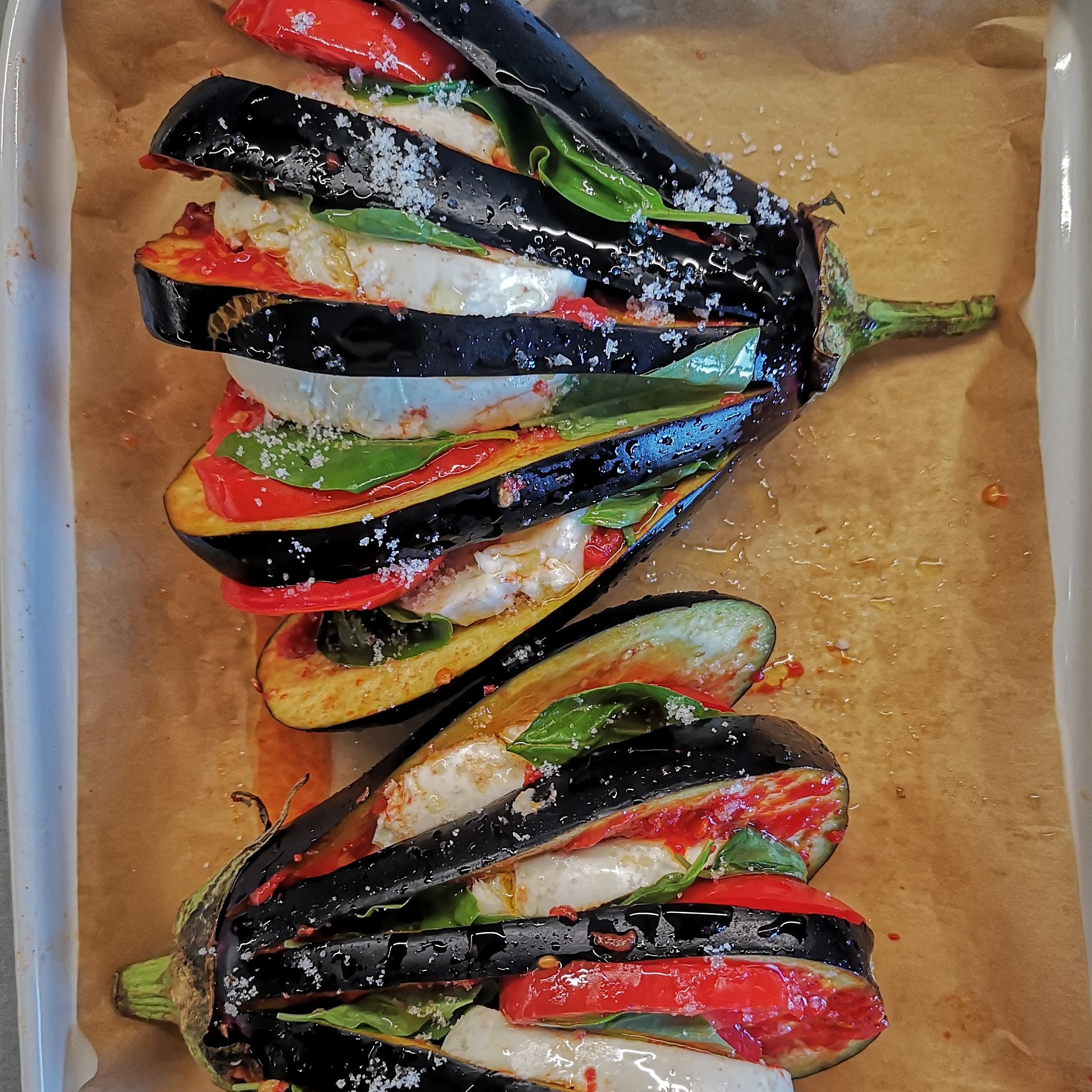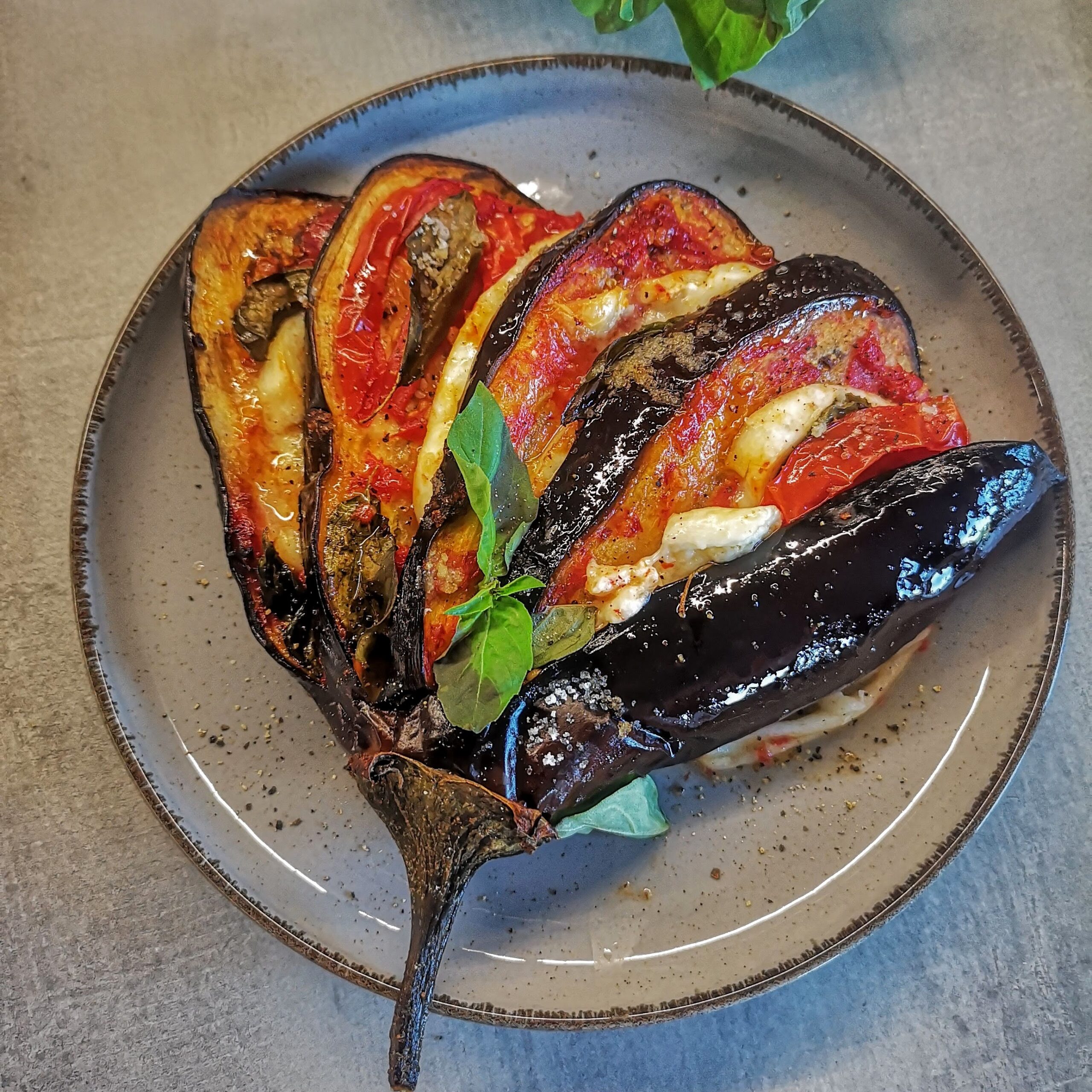 Добавете между резените патладжан филии моцарела, резени пресен домат и листа босилек. Полейте със струйка зехтин.1 бр. домат, 2 бр. моцарела, 10 листа босилек, 10 мл зехтин