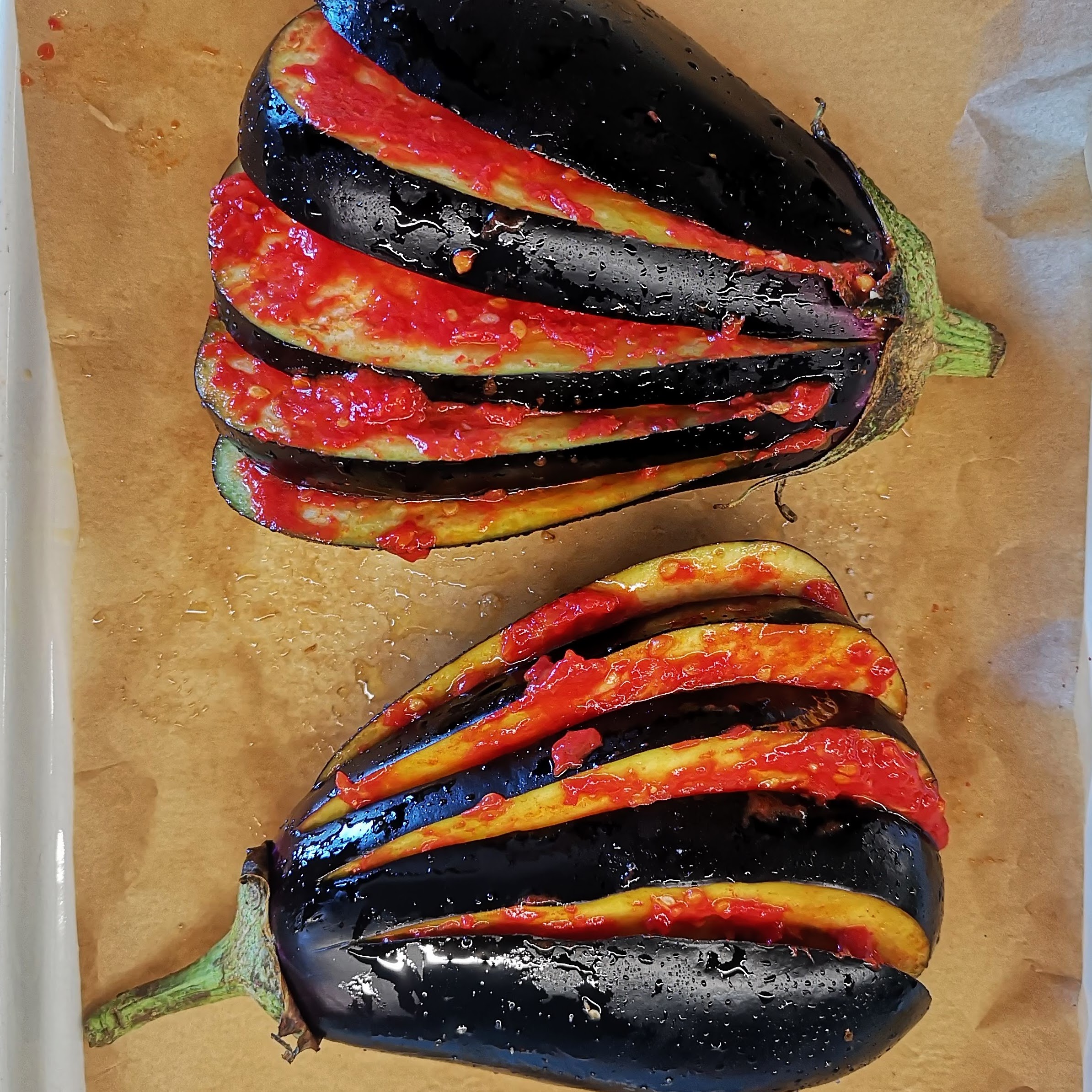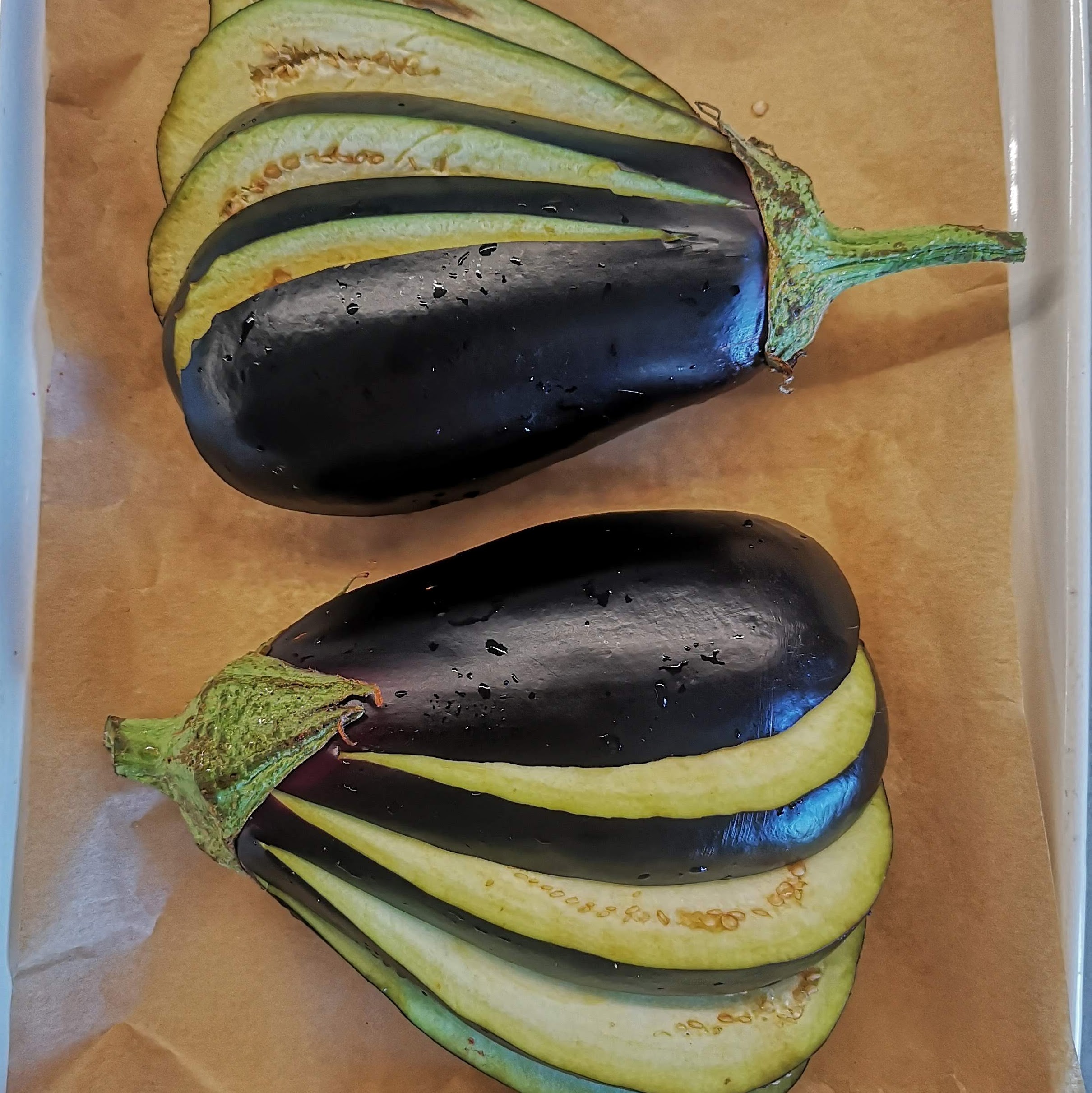 Разрежете патладжаните на филии, така, че да не стигате до края и да останат прикрепени към дръжката. Намажете от всички страни със зехтин и посолете.2 бр. патладжан, 10 мл зехтин