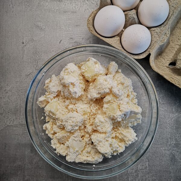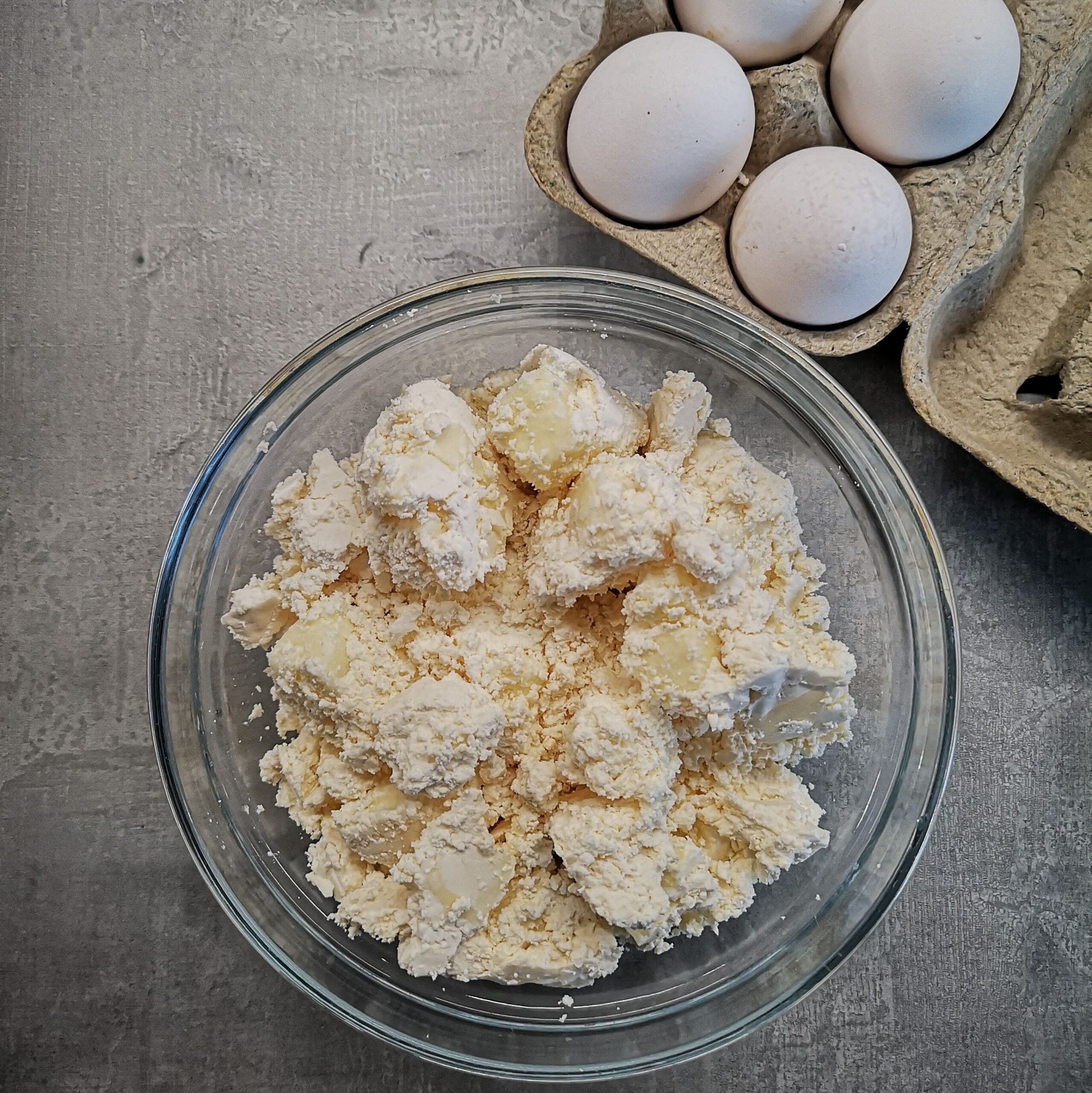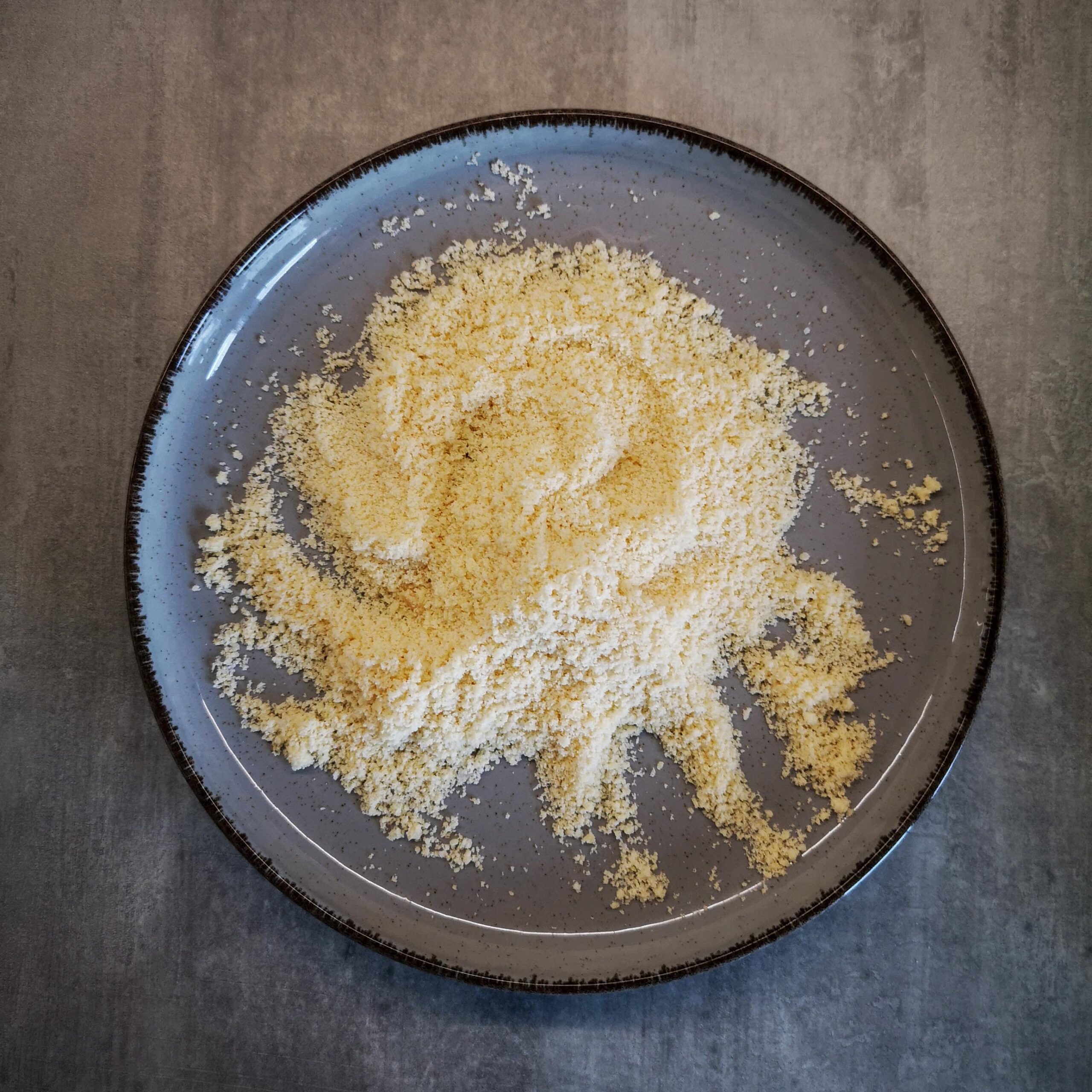 Загрейте фурната на 175°С с обдухване. Смесете заедно пармезана, бадемовото брашно и солта.50 г бадемово брашно, 50 г пармезан, 1/2 ч. л. сол