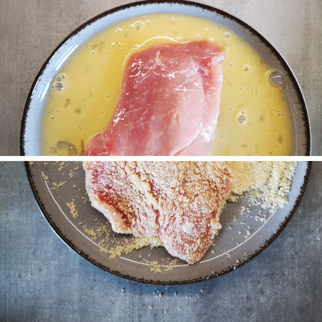 Потопете всяко парче шницел първо в разбито яйце. Оваляйте след това в "панировка".1 бр. яйце, 600 г свински шницели