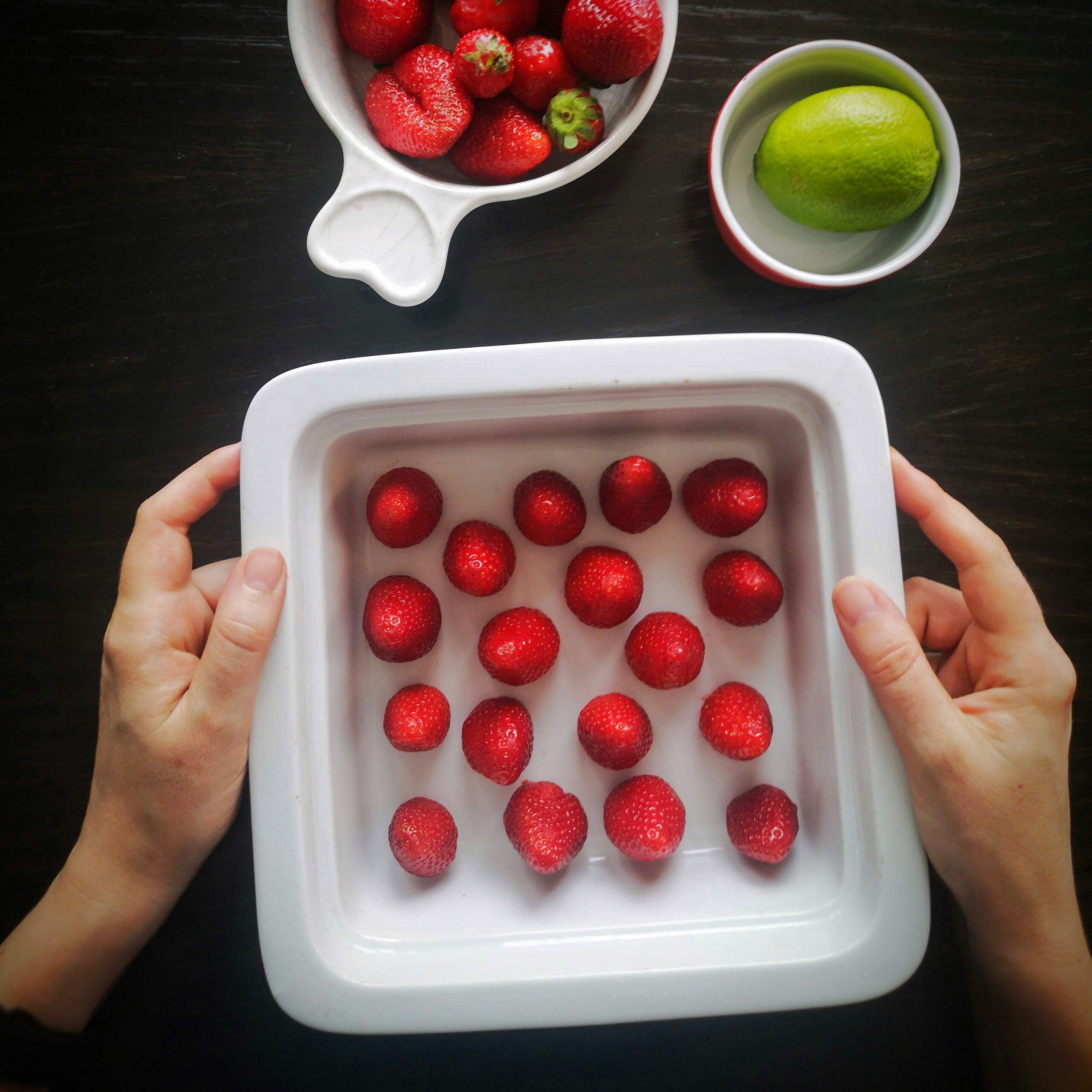 Намаслете много фин слой кокосово масло в съд с размери около 15/15 см. Подредете ягодите като отрежете дръжките в основата така, че да стоят изправени.300 г ягоди