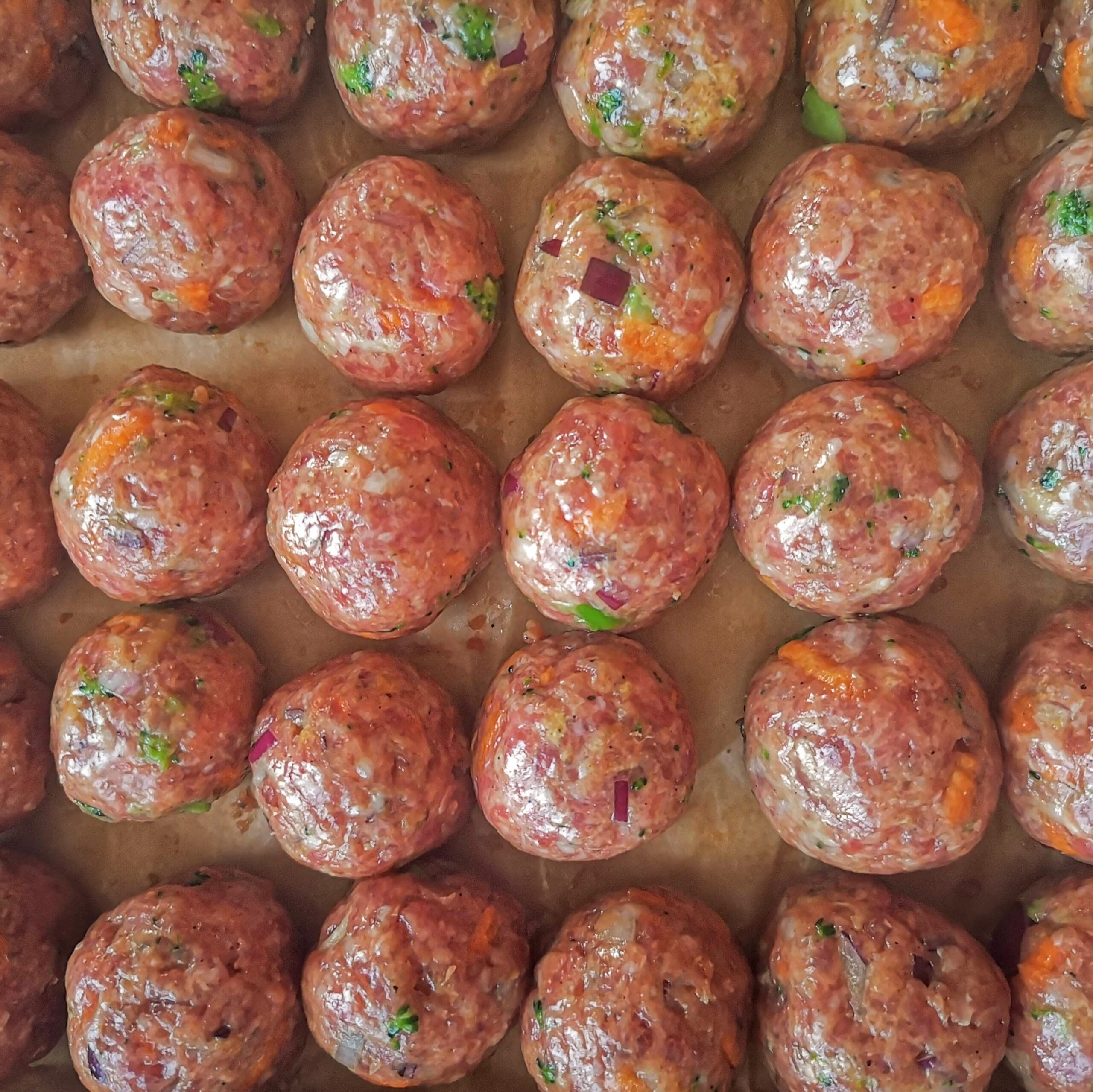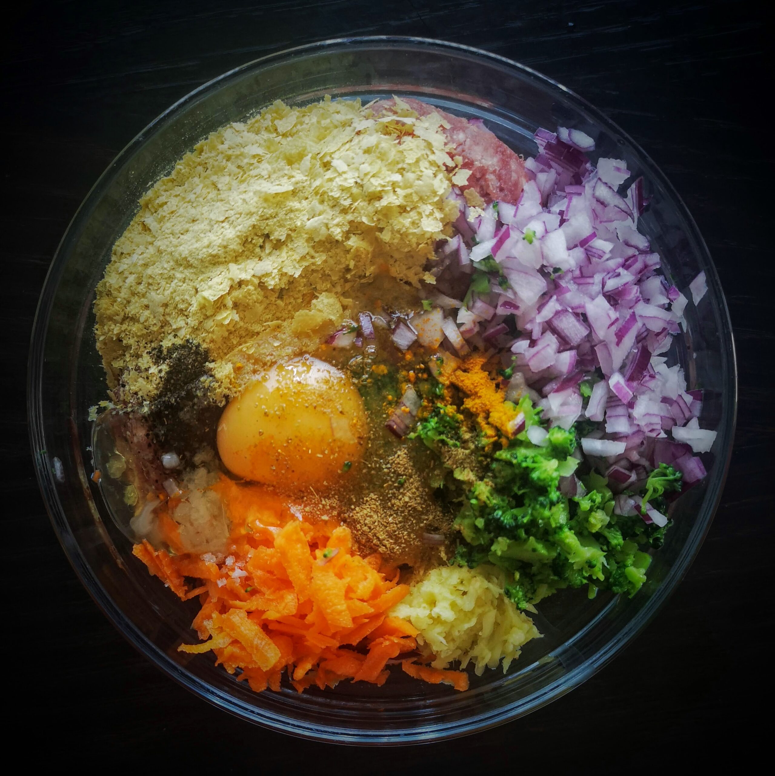 Омесете добре с ръце месото, яйцето, зеленчуците и всички останали подправки.500 г мляно говеждо месо, 1 бр. яйце, 50 г броколи, 1 бр. морков, 1 ч. л. пресен джинджифил, 1/2 глава червен лук, 20 г хранителна мая, 1/4 ч. л. кимион на прах, 1/4 ч. л. куркума на прах, 1/2 ч. л. морско сол, 1/4 ч. л. черен пипер, 1 скилидка чесън