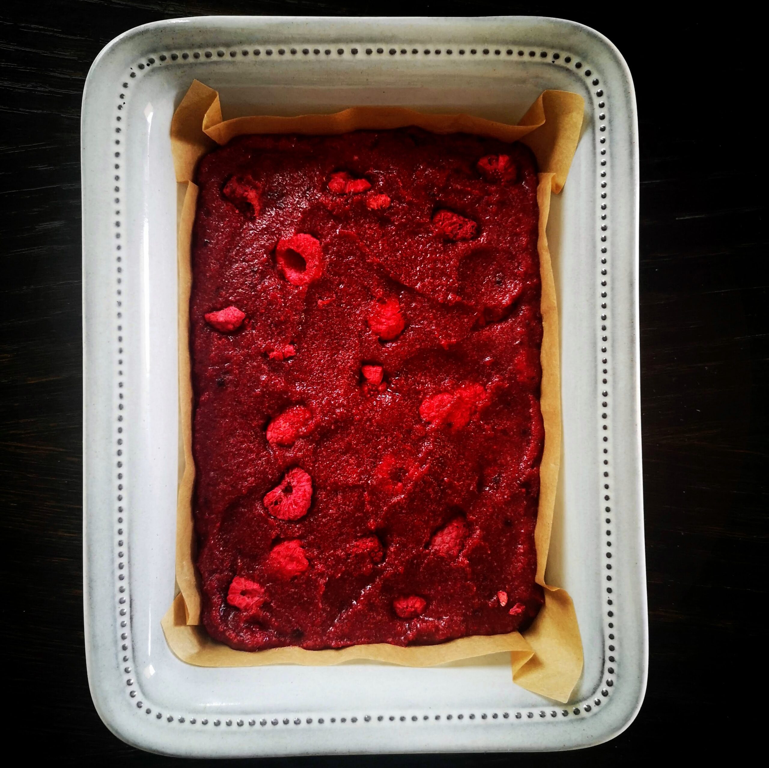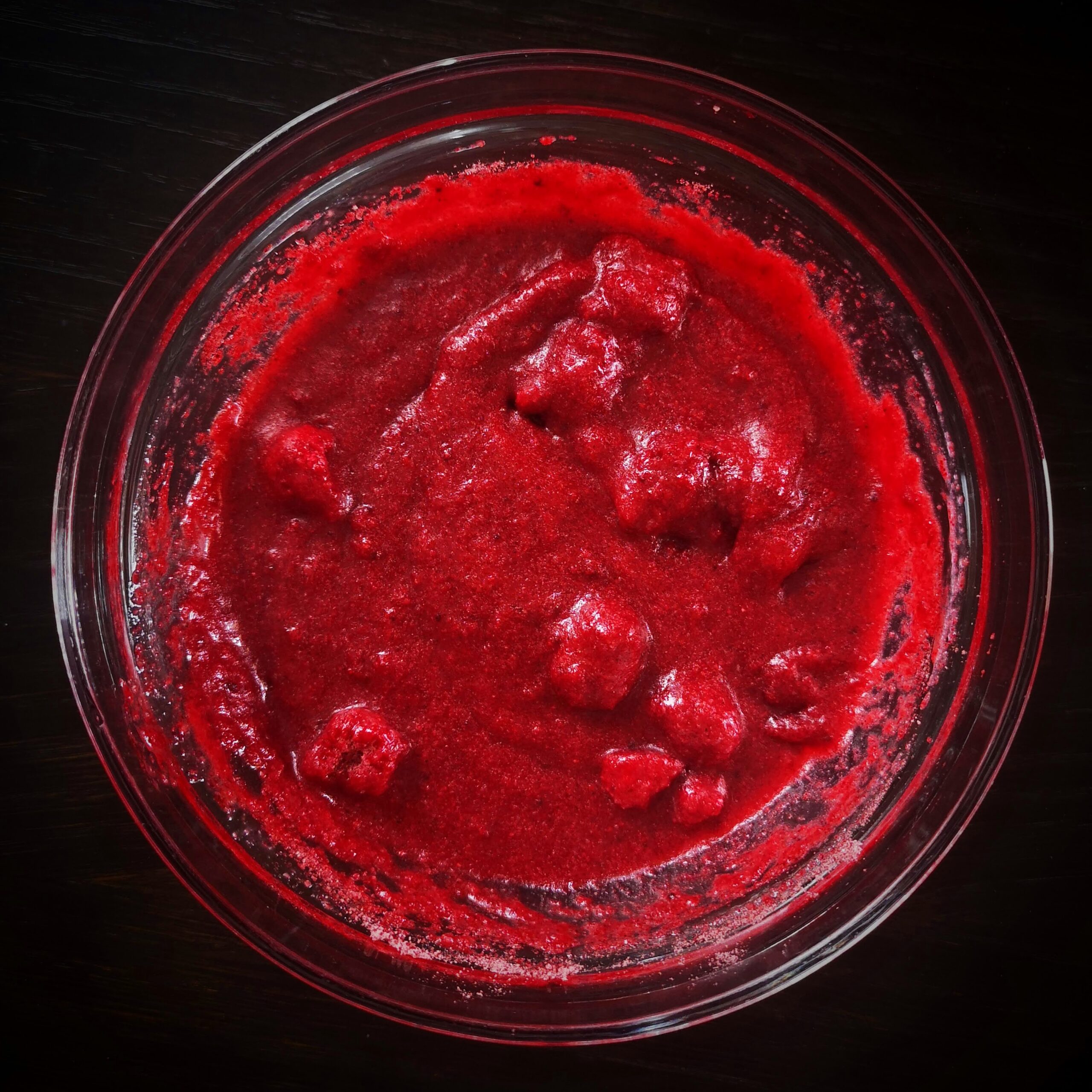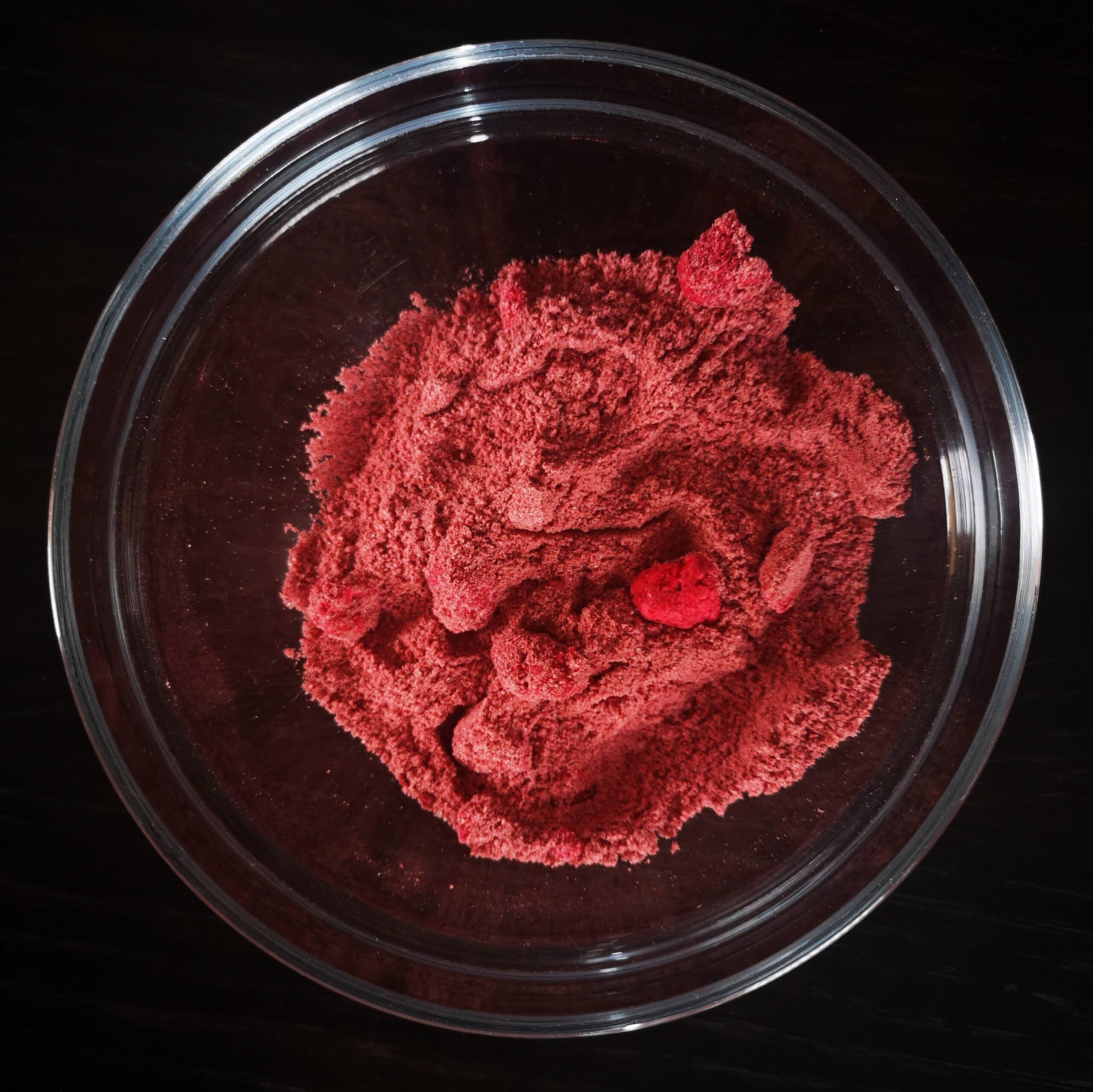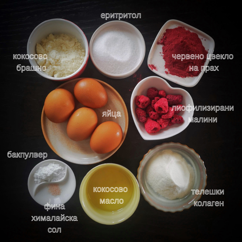 Претеглете и смесете сухите продукти.20 г кокосово брашно, 20 г еритритол, 20 г прах от червено цвекло, 15 г колаген, 10 г лиофилизирани малини, 4 г бакпулвер, 1 щипка сол