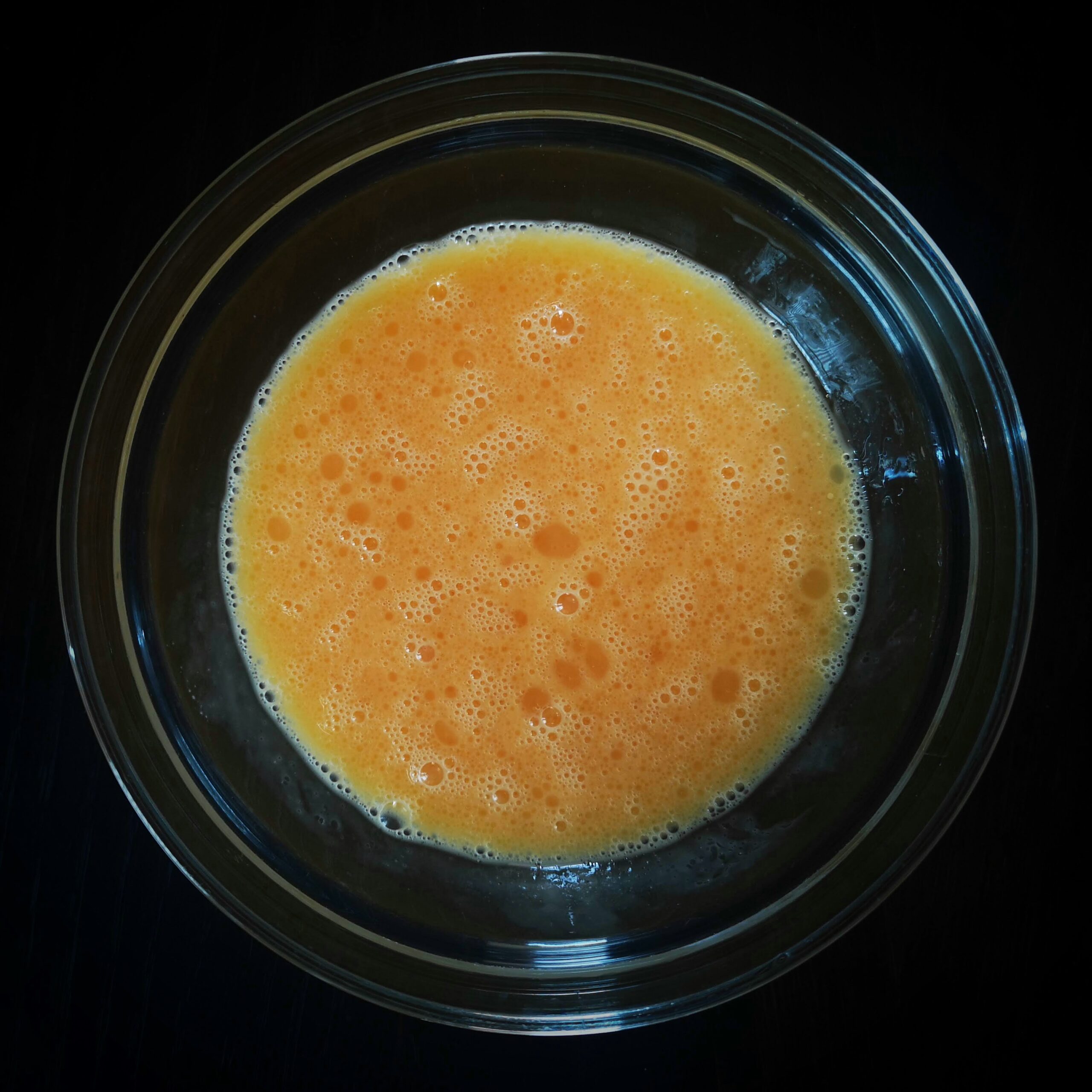 Стопете маслото докато стане течно и разбийте леко на ръка яйцата с него.40 г кокосово масло, 4 бр. яйца