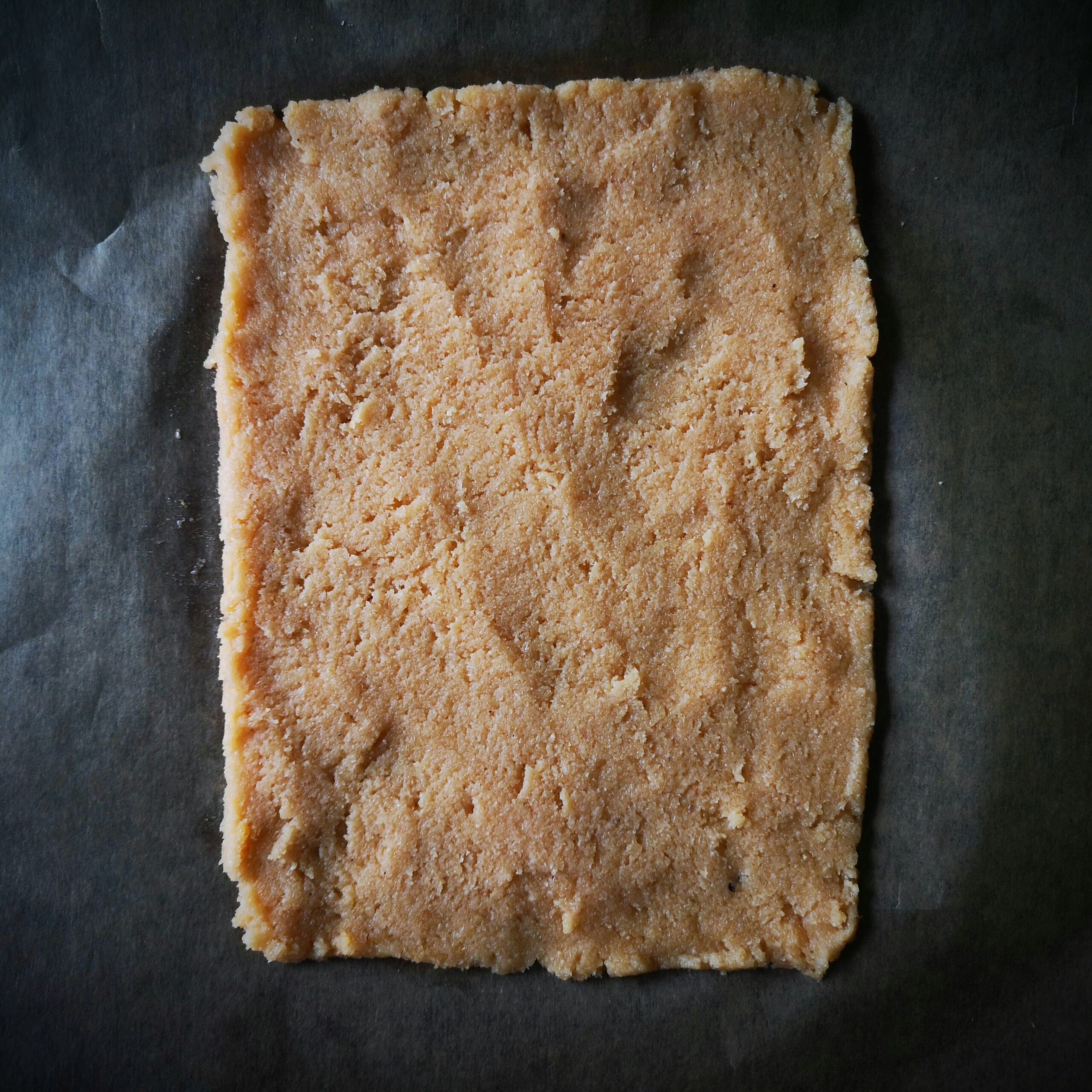 Застелете широка тавичка с хартия за печене. С помощта на лъжица разпределете на тънък блат 0,5см. Подравнете и оформете квадратна или правоъгълна форма.