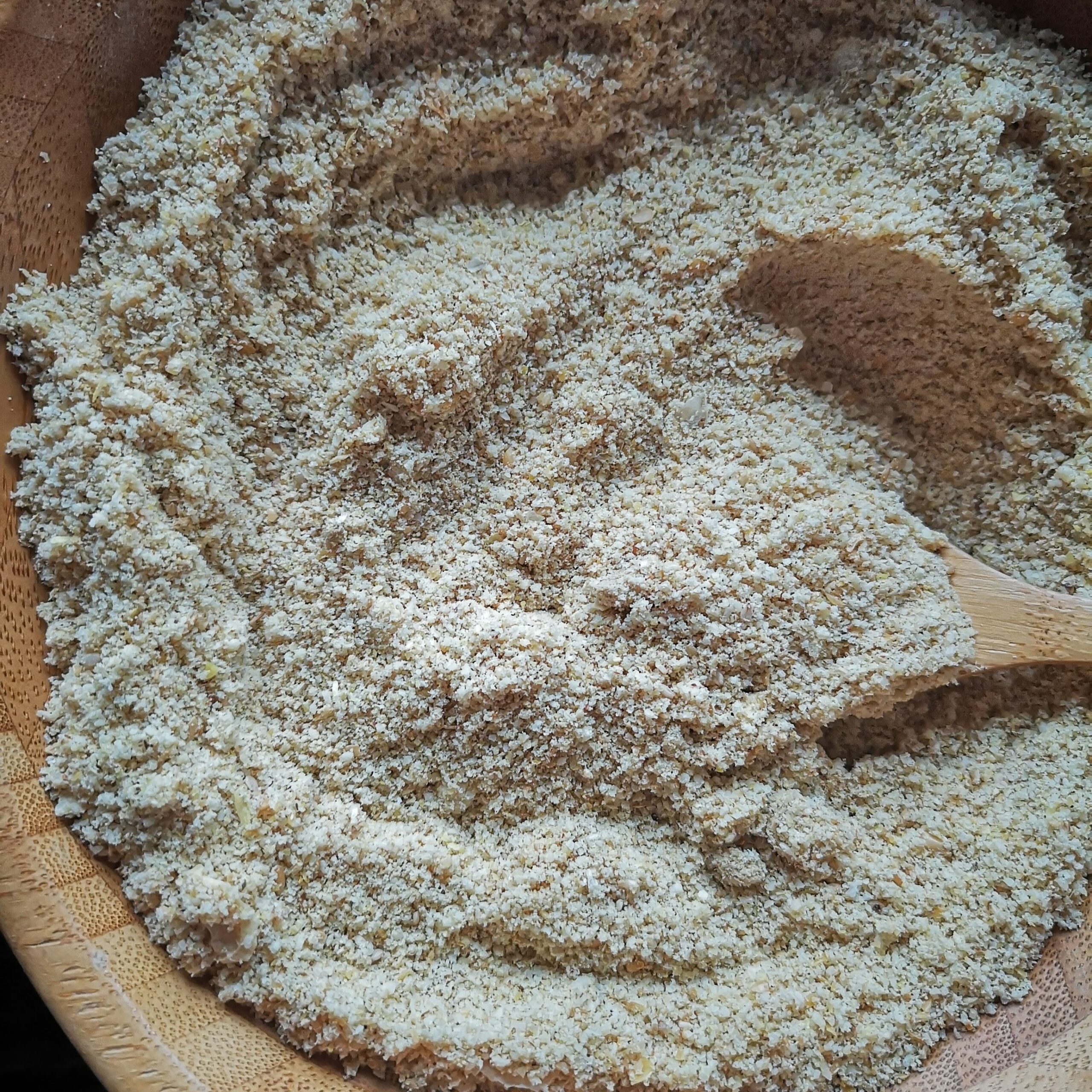 В блендер за сухо смилане или мелничка смелете лененото семе, сушения лук, сусамовите семена и хранителната мая. Към получения прах добавете бадемовото брашно, отмереното количество псилиум хуск, солта и бакпулвера. Разбъркайте добре и елиминирайте бучици.100 г пълномаслено бадемово брашно, 50 г златно ленено семе, 40 г сусамови семена, 20 г сушен лук, 1/2 ч. л. сол, 10 г хранителна мая, 10 г псилиум хуск, 1 ч. л. бакпулвер
