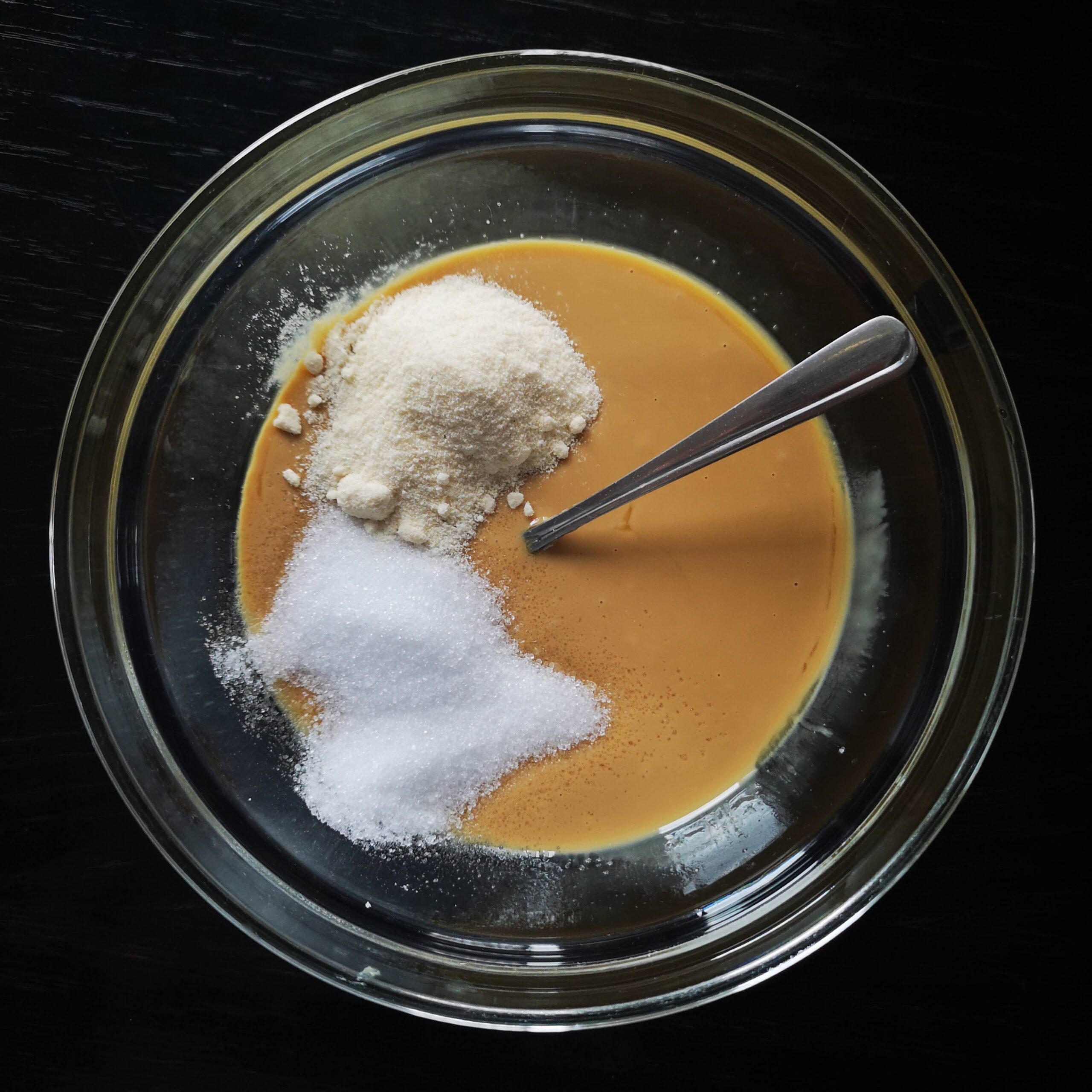 Отмерете и добавете останалите продукти и объркайте.20 г кокосово брашно, 30 г еритритол, 1 щипка хималайска сол