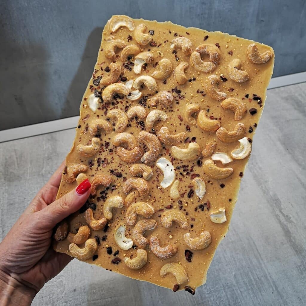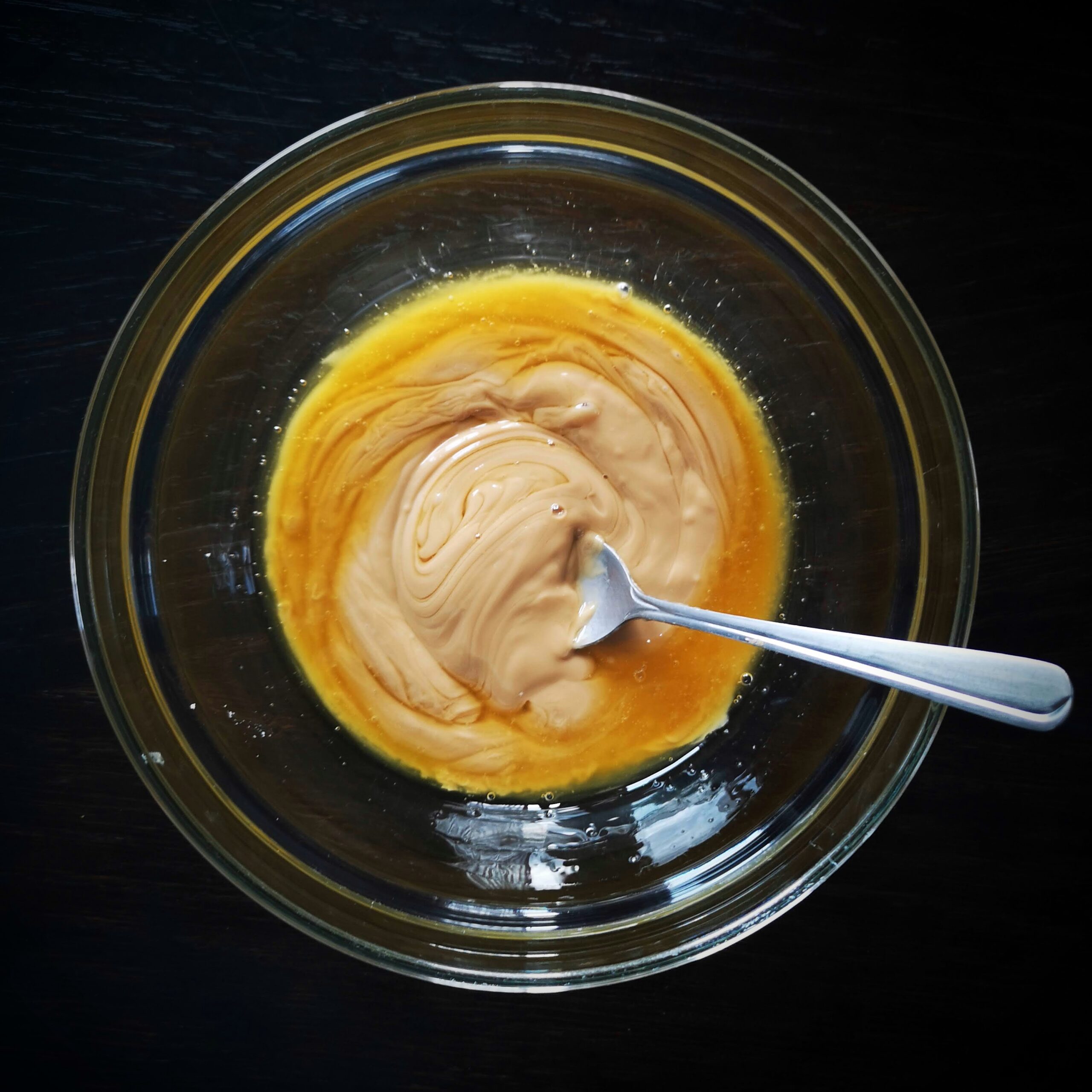 Прибавете и смесете разтопеното какаово масло с тахана от кашу, като объркате внимателно с лъжица.150 г тахан от кашу
