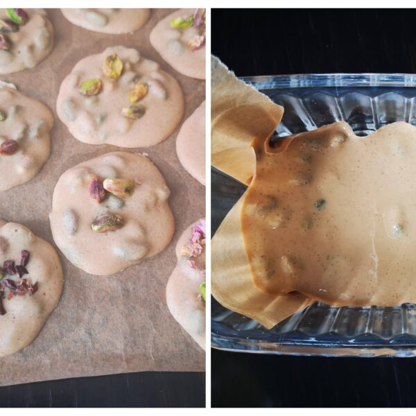 Разпределете с лъжица върху хартия за печене, покрийте с избрани продукти, охладете и хрупайте на воля.