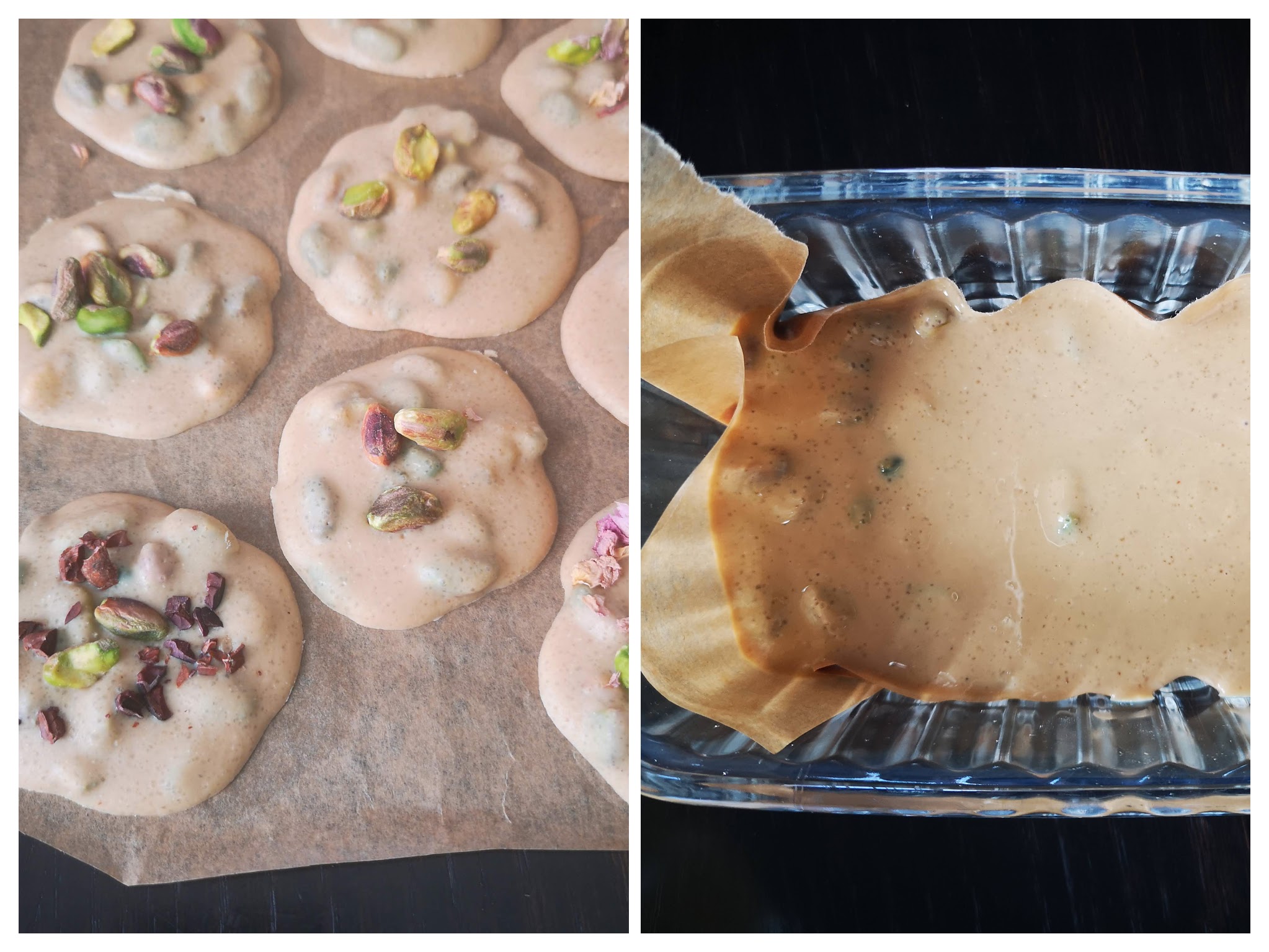 Пригответе сместа, следвайки рецептата и я разнесете в разлат съд върху хартия за печене. Поръсете с продукти, които сте избрели. Охладете.