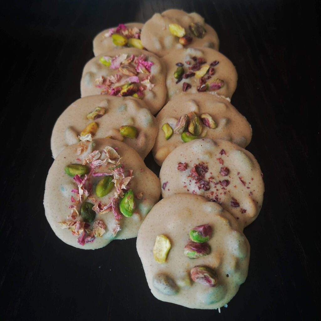 Аз залагам на хрупкам шамфъстък, рози и счукани парченца какаови зърна.