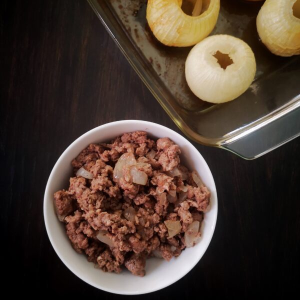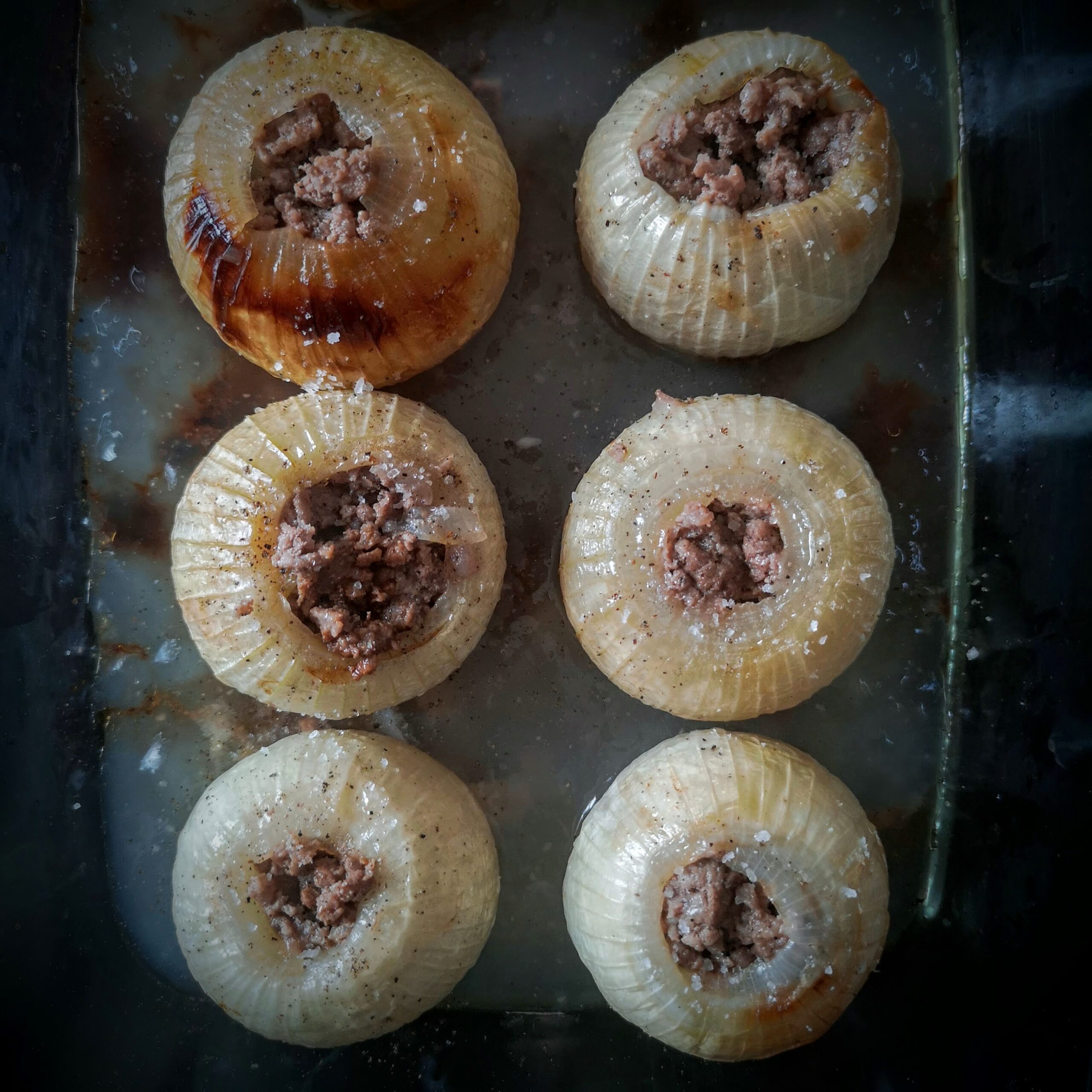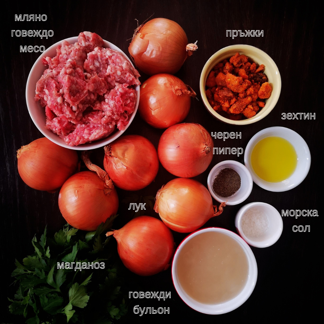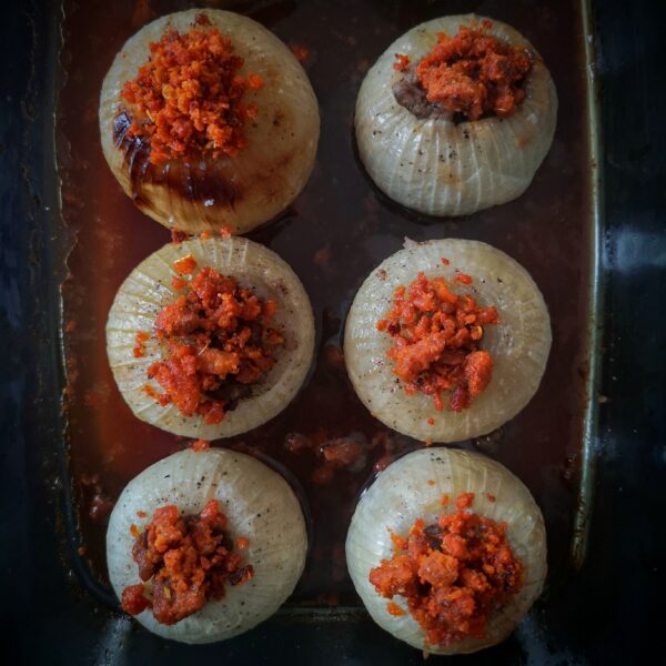 Лукът се пълни с ароматен пълнеж от говежда кайма и се запича до съвършенство.