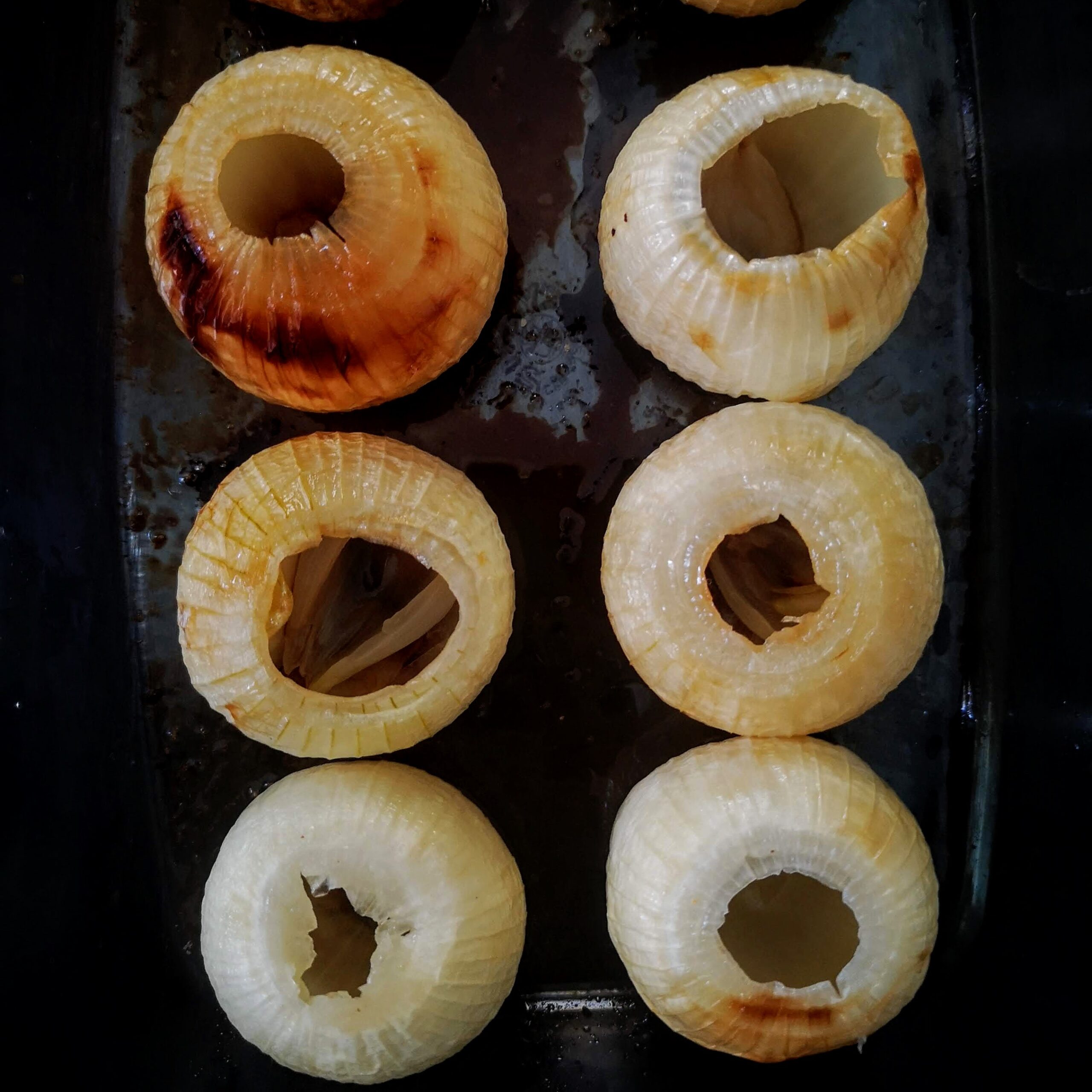 За хрупкав елемент и акцент на пълнения лук – топинг от пръжки в последната част от печенето.