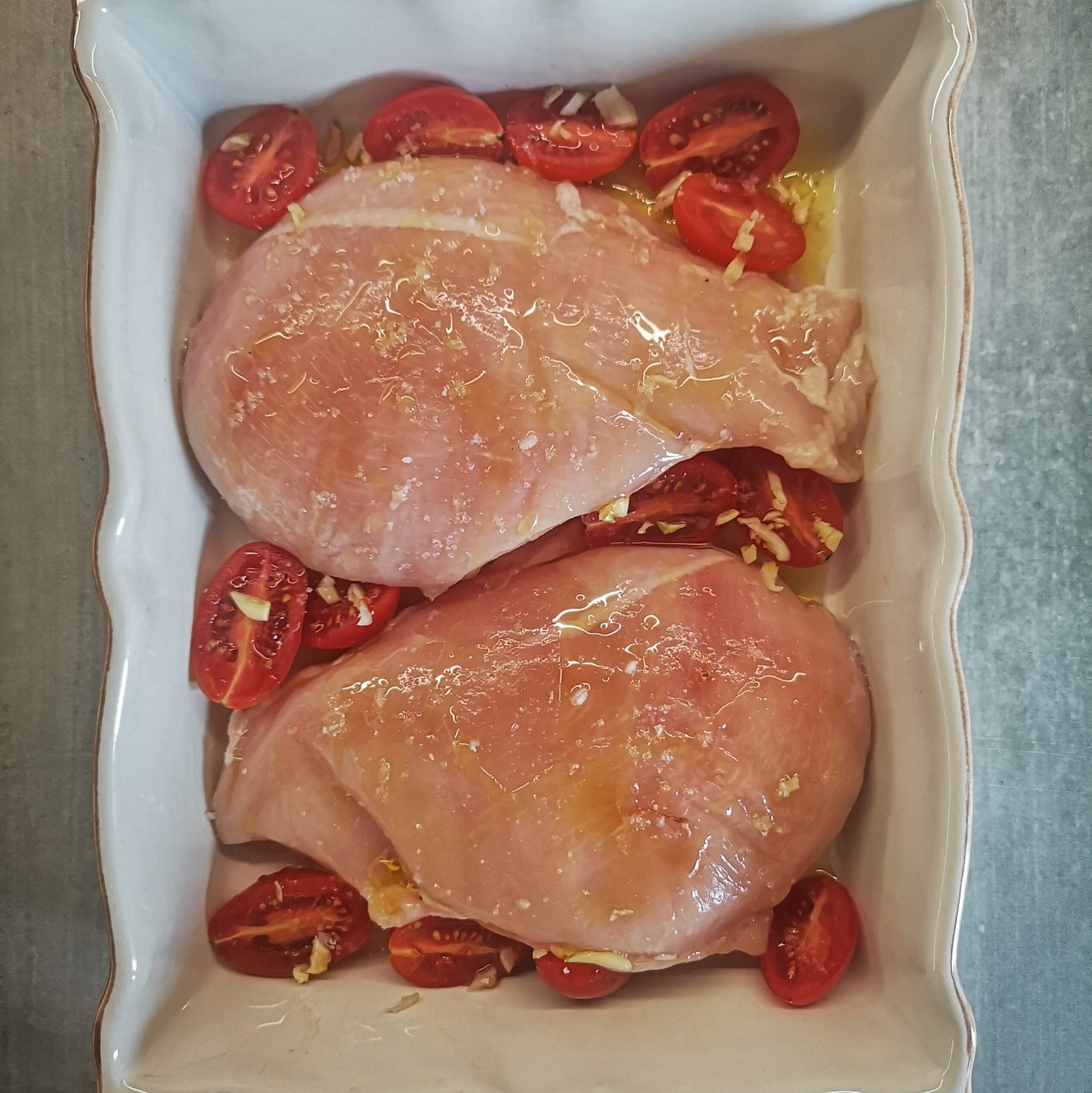 В съд за печене положете пилешките гърди. Около тях разпределете разполовените чери домати, покрийте със смачкан чесън и посолете. Полейте със зехтин. Печете 25 минути.2 бр. пилешки гърди, 1 ч. л. сол, 100 г чери домати, 20 мл зехтин