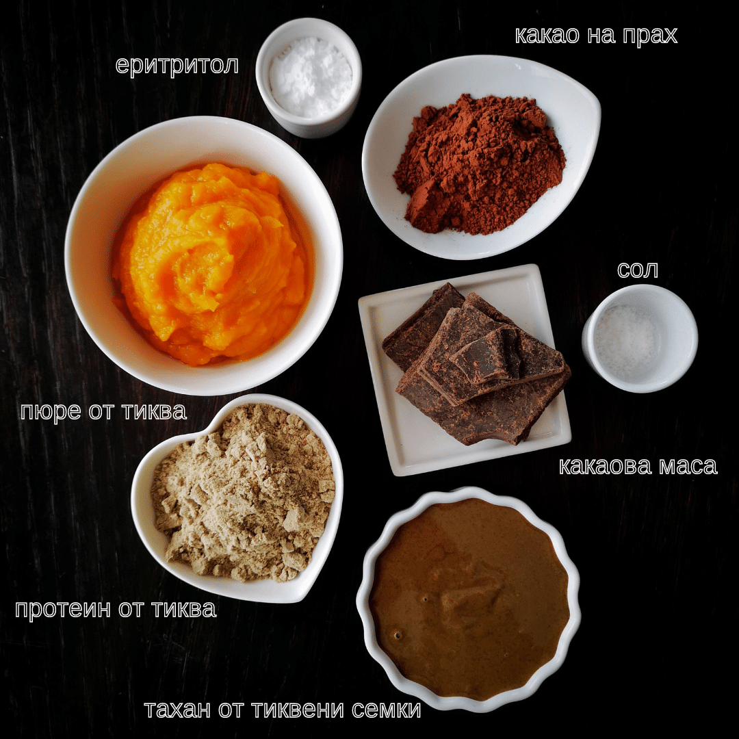 В моя вариант замених тиквения протеин с шоколадов протеин изолат и използвах високо протеиновото фъстъчено масло на балчо вместо тахан.