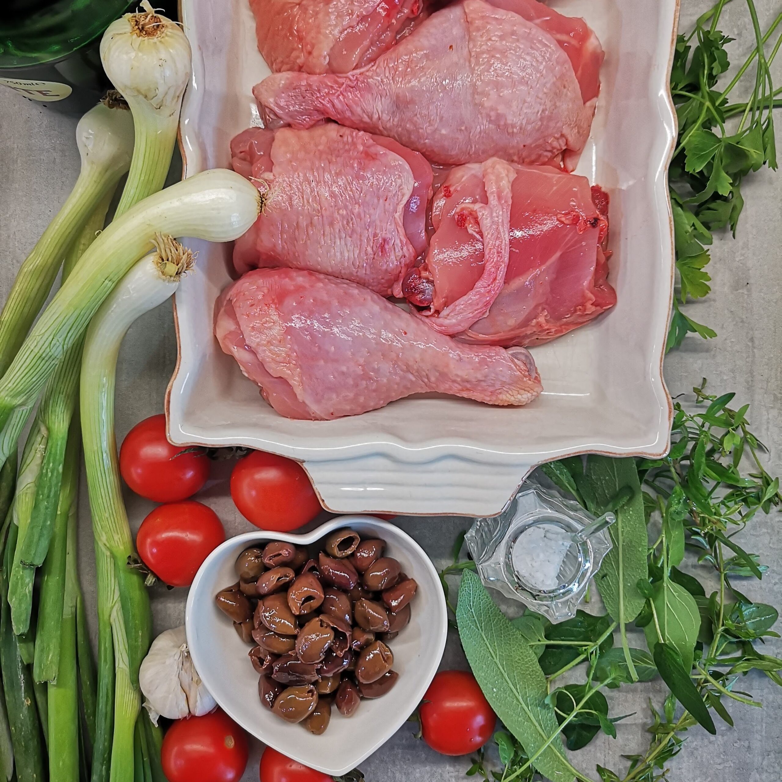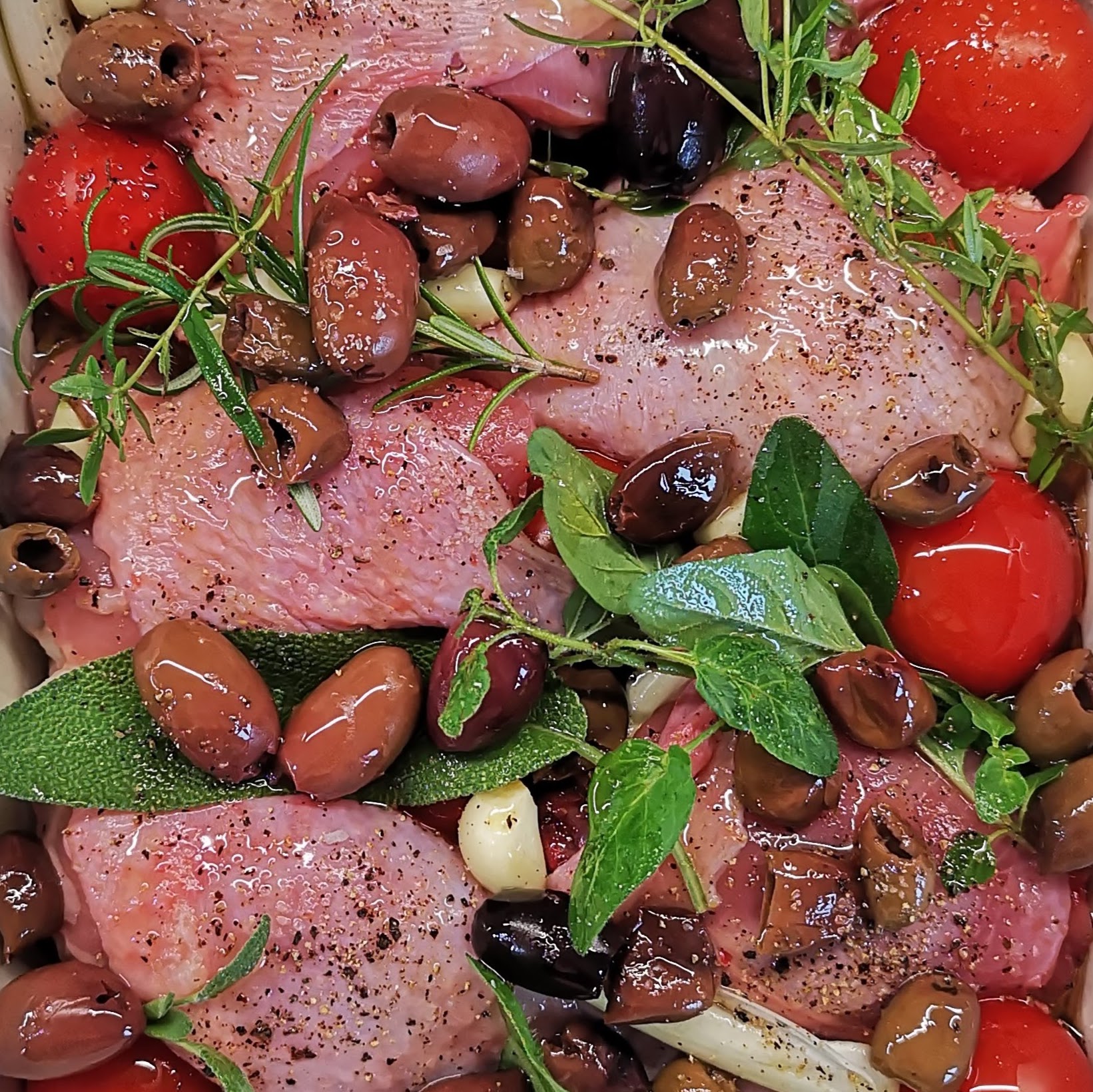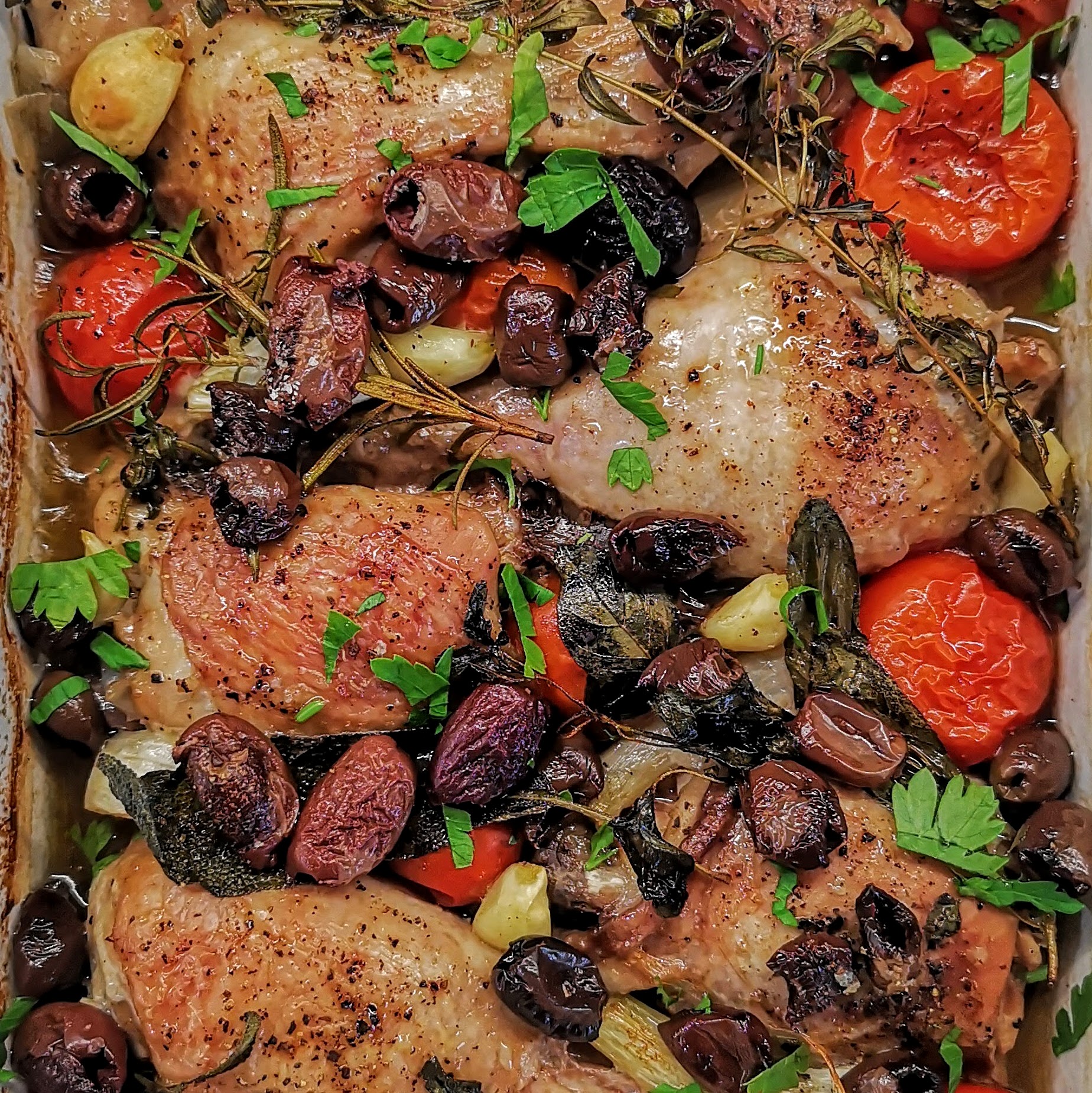 Крехко пиле, подправено с ароматни билки, приготвено в бяло вино с пресни домати, маслини, чесън и лук. Достатъчно лесно за всяка делнична вечер.