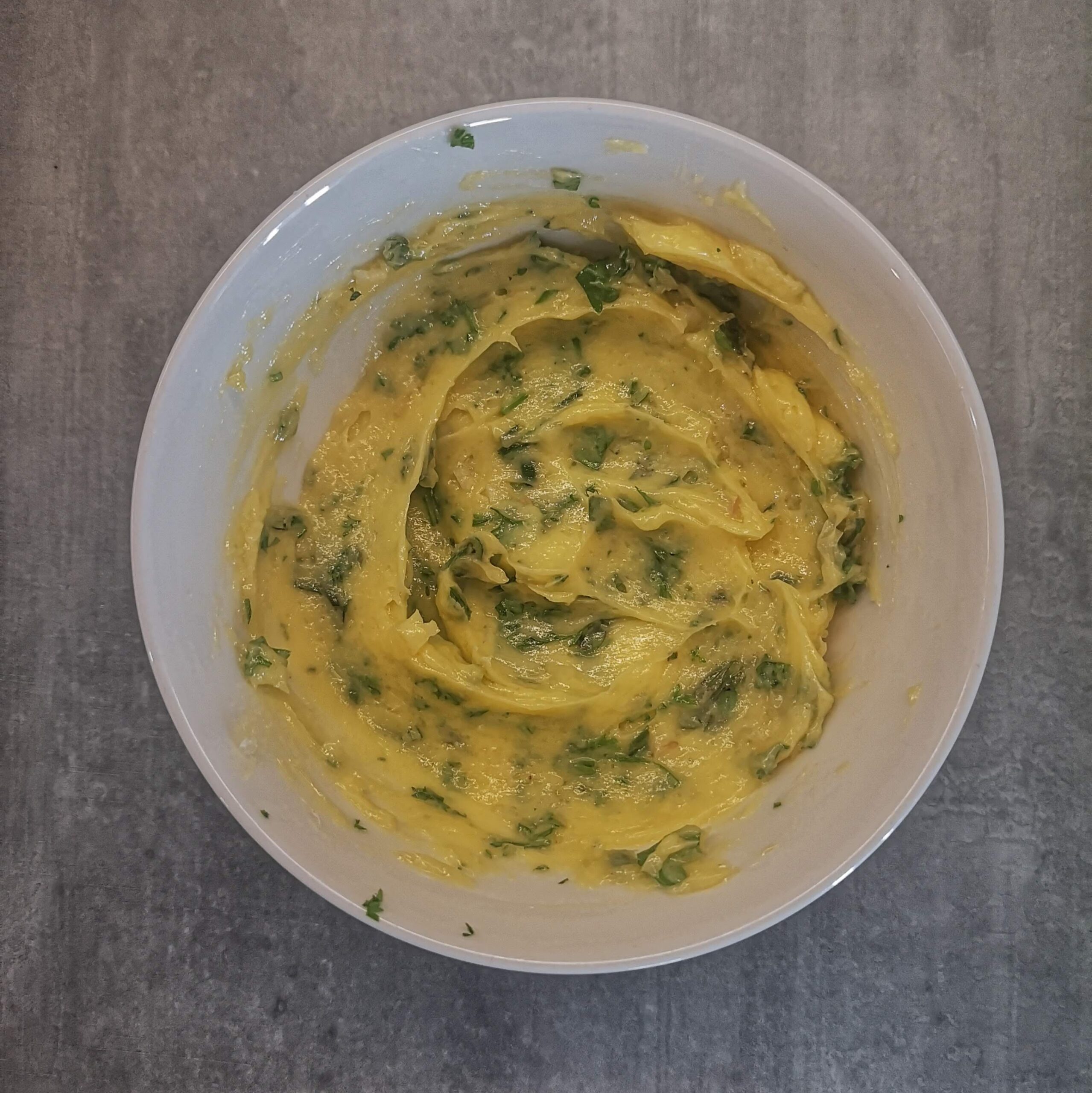 Пригответе маслената билкова коричка: объркайте в мекото масло наситнените билки, смачкания чесън и сол.50 г краве масло, 1/2 връзка пресни билки, 2 бр. скилидки чесън, 1 ч. л. сол