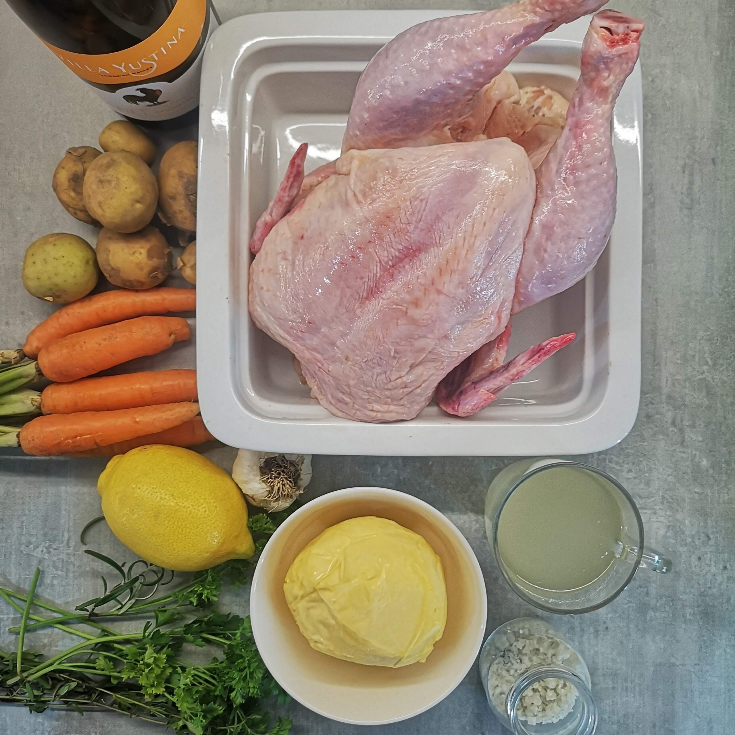 На дъното на форма за печене наредете дребните картофки и моркови. Положете подсушеното пиле отгоре и натрийте със сол отвън и отвътре. Напълнете пилето с половин лимон и срязана напречно глава чесън. Намажете обилно цялото пиле и част от зеленчуците като използвате цялото билково масло. Долейте с вино и бульон.1 бр. цяло пасищно пиле, 1 ч. л. сол, 1 бр. глава чесън, 5-6 бр. моркови, 5-6 бр. картофки, 50 мл костен бульон, 50 мл бяло вино, 1/2 бр. лимон