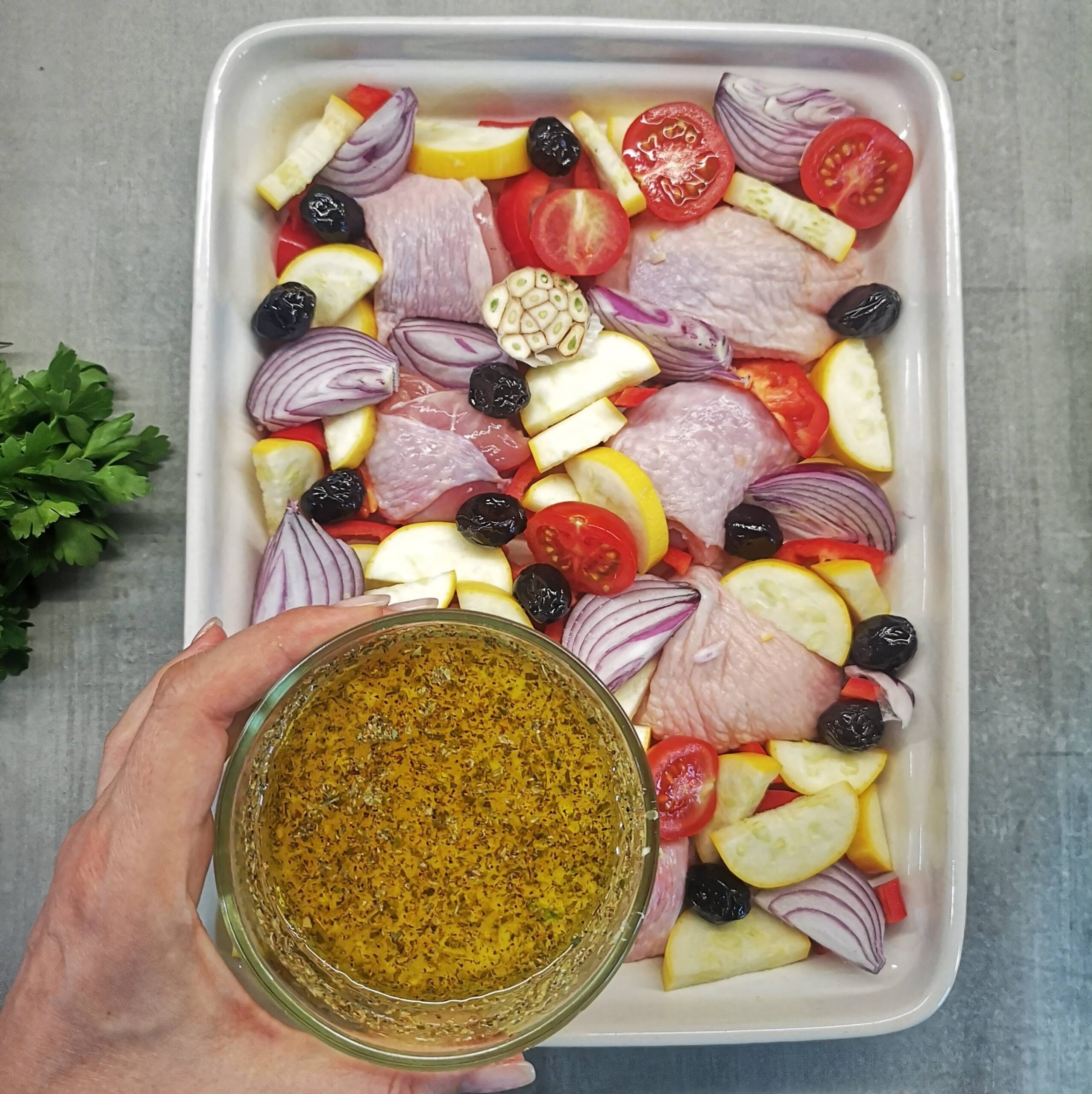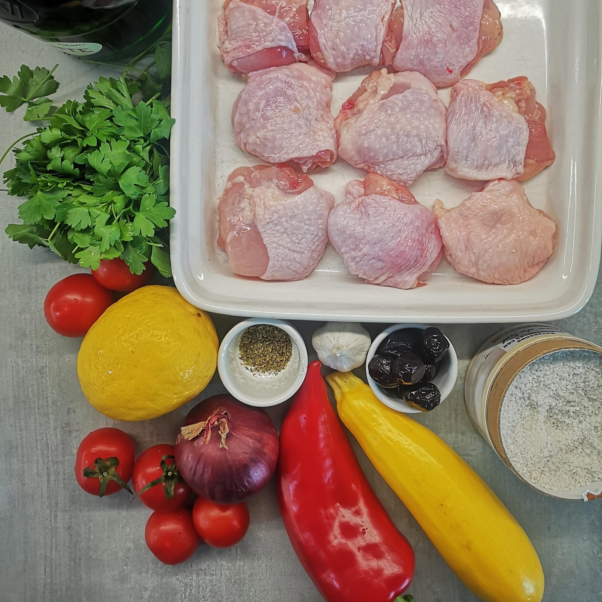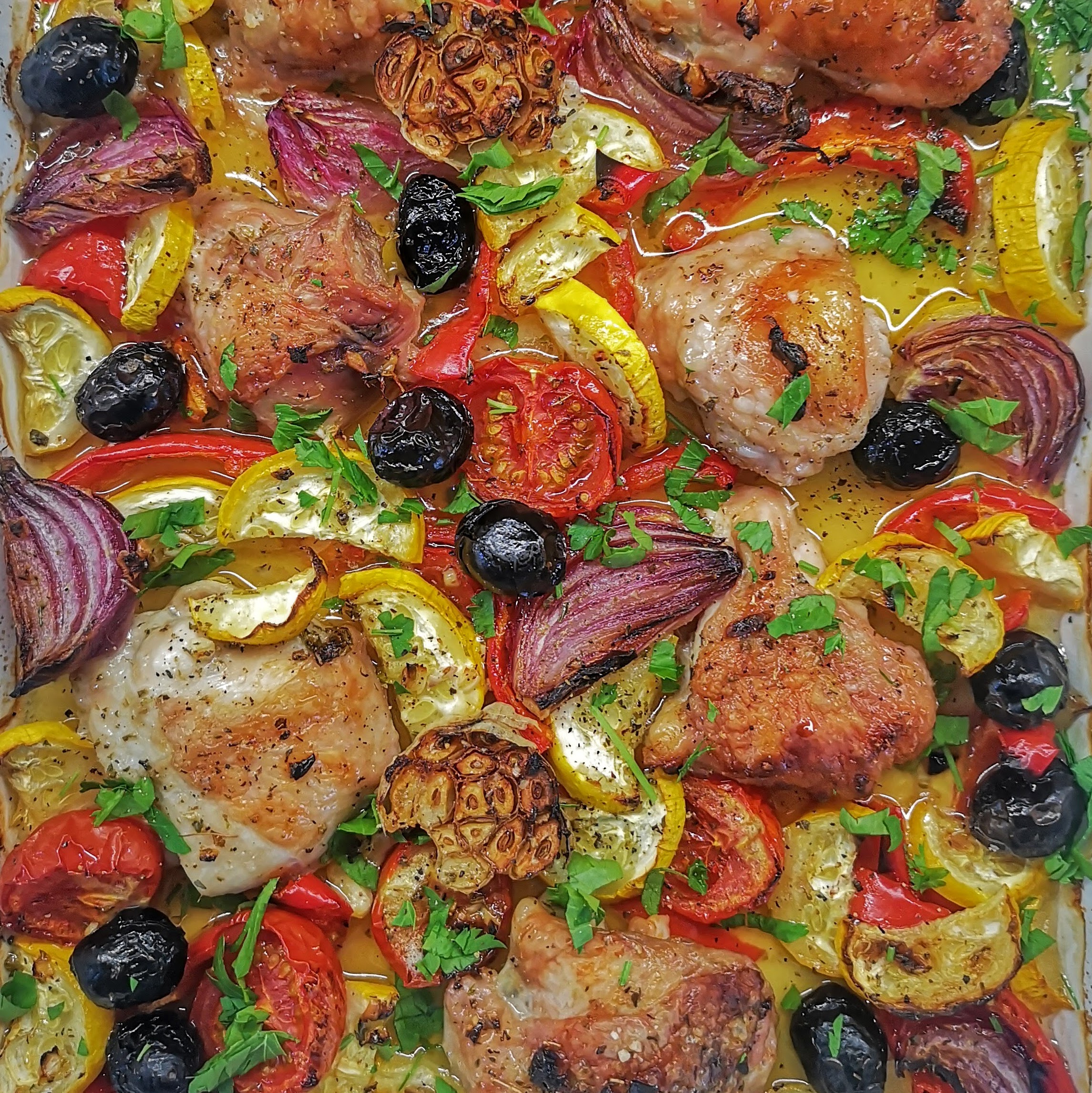 Нарежете зеленчуците – чери домати разполовени, червен лук на резени, чушка и тиквичка на парчета, главата чесън разполовена, без да премахвате люспите. Подредете ги в тава. Върху тях разпределете пилешкото месо от бут, всяко разполовено, и маслините. Залейте с лимоновия сос.800 г пилешко месо от бут, 80 г маслини, 100 г чери домати, 1 бр. глава чесън, 1 бр. тиквичка, 1 бр. глава червен лук, 1 бр. червена чушка