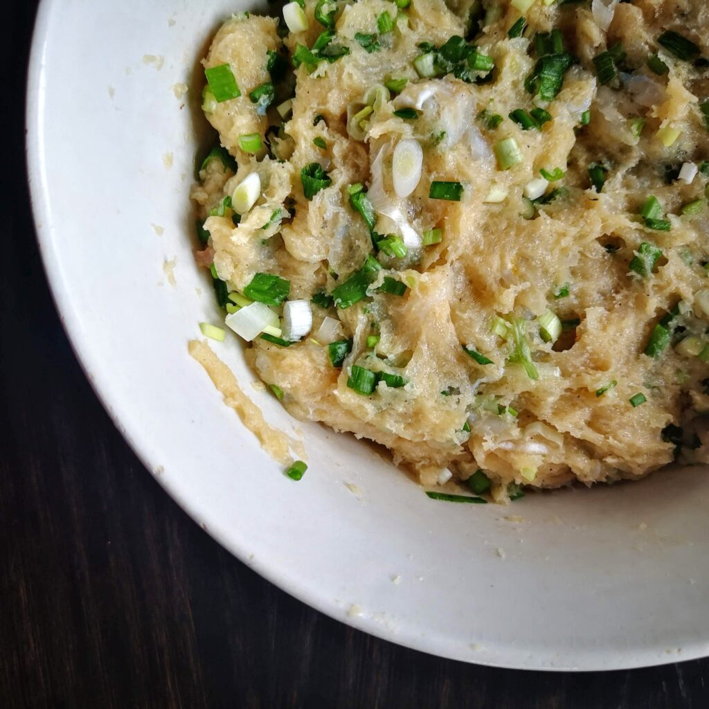 Почистете връзката зелен лук и нарежете на ситно. Омесете с ръце наситнения лук и рибното тесто. По консистенция то много ще наподобявя истинско тесто, ще бъде еднородно и еластично. Така изглежда готовото рибно "тесто" :1 връзка пресен зелен лук