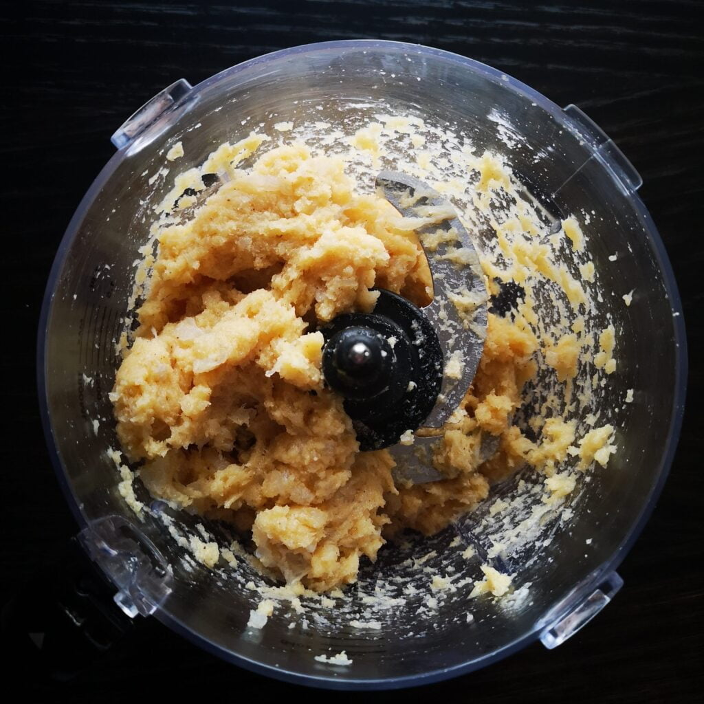 Поставете в блендер подсушената сурова риба, нарязана на едро, яйцата и отмереното кокосово брашно. Добавете горчицата, чесън и подправки – сол и черен пипер. Смелете на тесто. Това ще отнеме не повече от 30 секунди.500 г филета бяла риба, 2 яйца, 20 г кокосово брашно, 1/2 ч.л. сол, 1 ч.л. горчица, 1 скилидка чесън, черен пипер