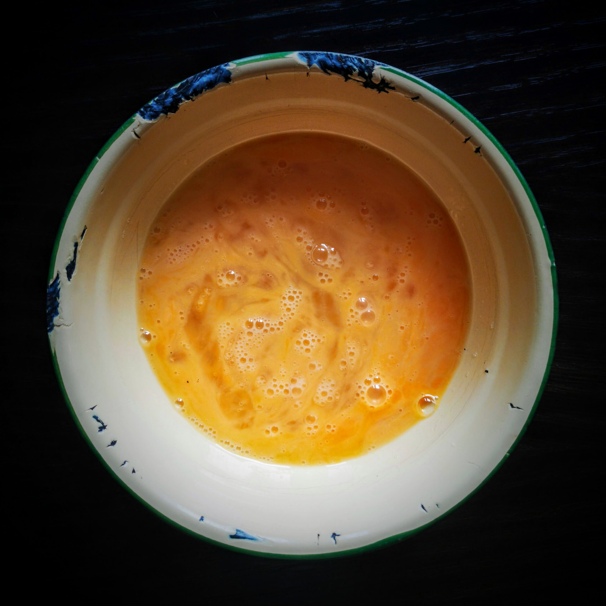 Разбийте яйцата, щипката сол и еритритола в купа с вилица.3 бр. яйца, 10 г еритритол, 1 щипка сол