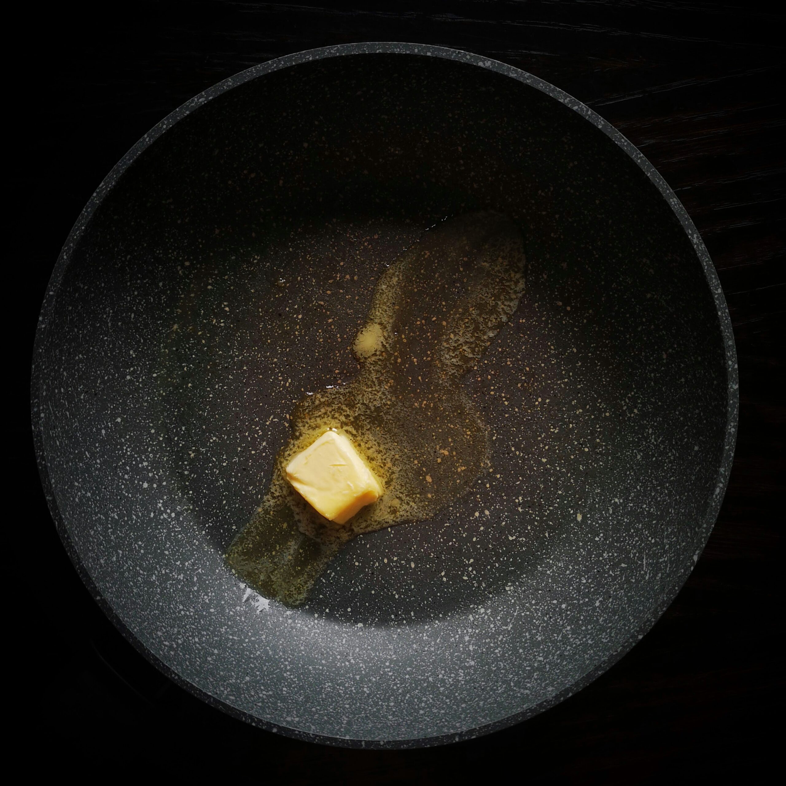 Загрейте и разтопете маслото на силен огън в тиган с незалепващо покритие.10 г масло
