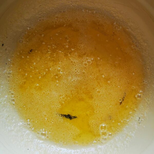 След като се разтопи, маслото ще започне да се пени и ще цвърчи по краищата. Продължете да бъркате. След около 6-8 минути от началото (в зависимост от количеството масло, което сте използвали), маслото ще промени цвета си до златисто-кафяво. Част от пяната ще спадне и млечните твърди частици на дъното на тигана ще станат препечено кафяви. Ще мирише интензивно на масло и ядки.