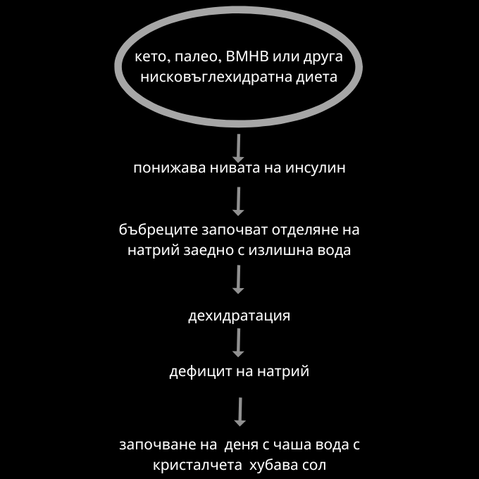 Понижената консумация на въглехидрати понижава естествено нивата на инсулин. Бъбреците започват отделяне на натрий, който е важен трансмитер заедно с излишната вода (да, точно тази вода, която ако консумирате неразумно въглехидрати ще задържите). Това може да доведе до дехидратация и дефицит на натрий, съответно електролитен дисбаланс. Ето защо соле, чаша вода с кристалче сол или сок от кисело зеле,