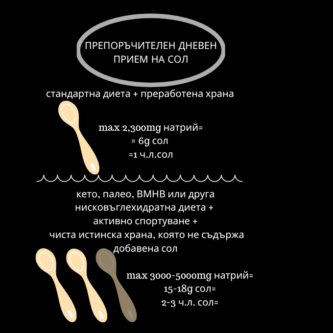 Обаче, трябва да имате предвид, че ако сте в нисковъглехидратния спектър трябва и може да приемате 15-18 г сол, докато ако сте на стандартна диета трябва да се ограничите до 6 г на ден.