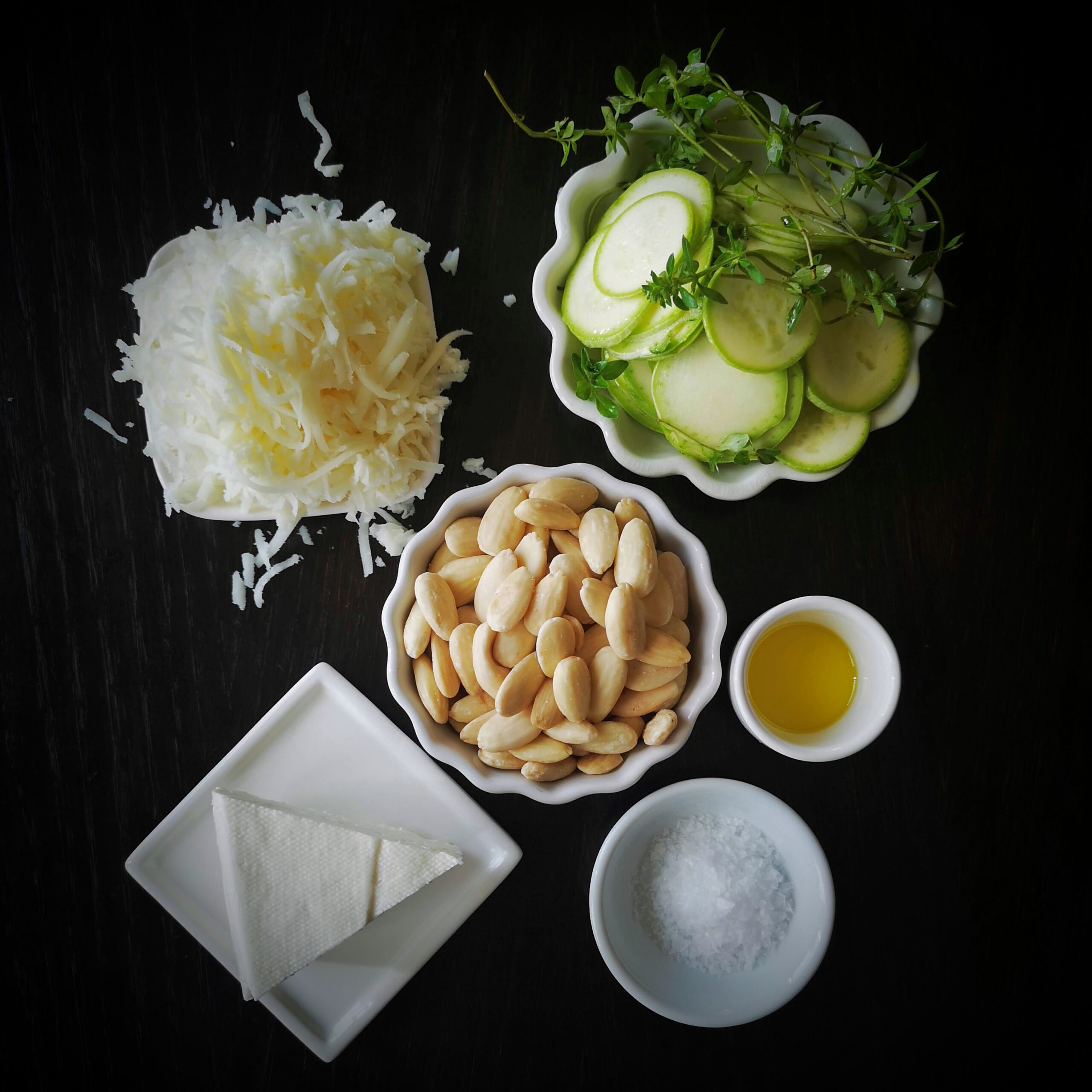 Подгответе продуктите като първо настържете кашкавала. Нарежете на много фини колелца тиквичките и ги намаслете заедно с мащерката нежно със зехтин.