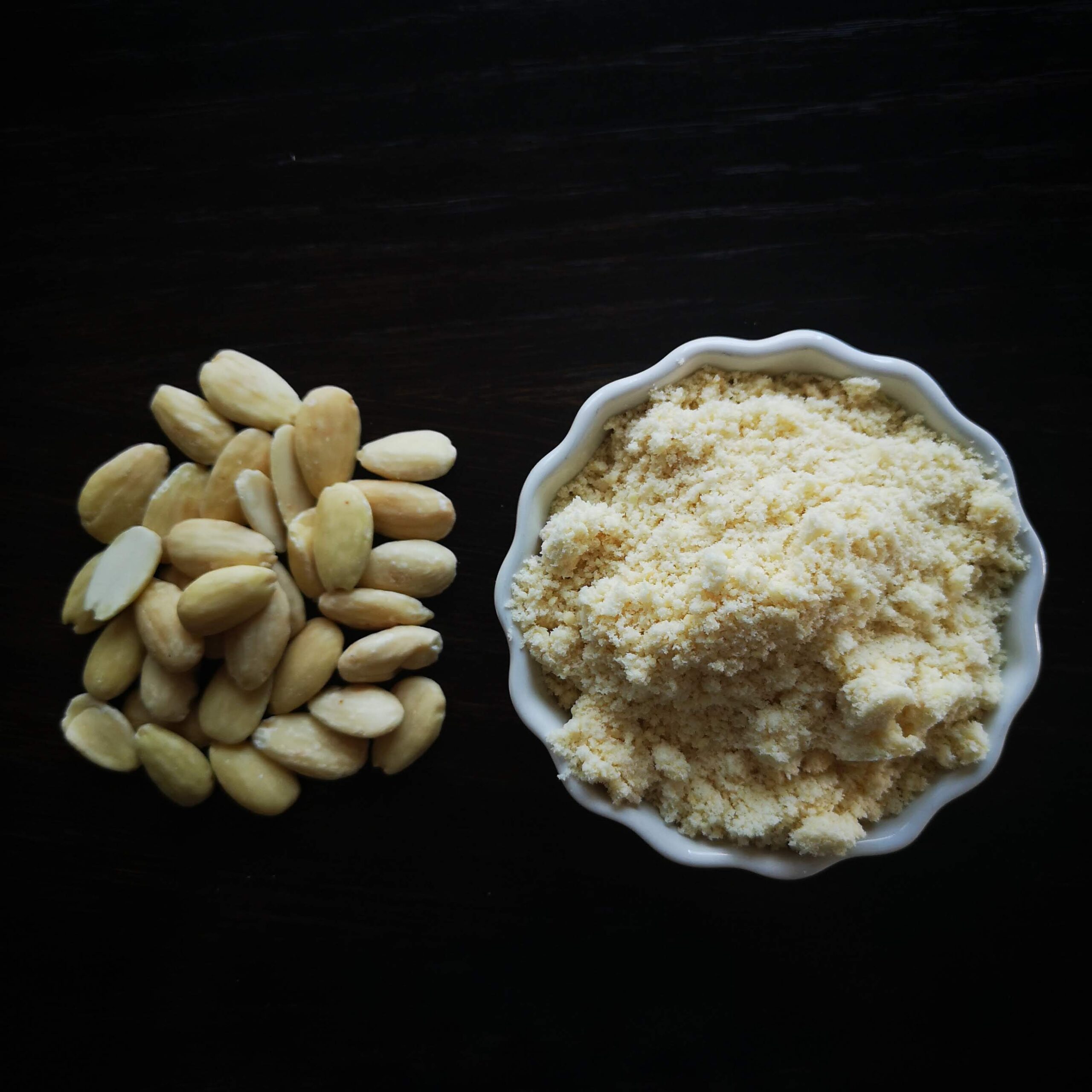 Смелете бланшираните бадеми за няколко секунди в блендер. Това ще бъде нашето домашно приготвено бадемово брашно. Ако използвате готово бадемово брашно пропуснете тази стъпка.