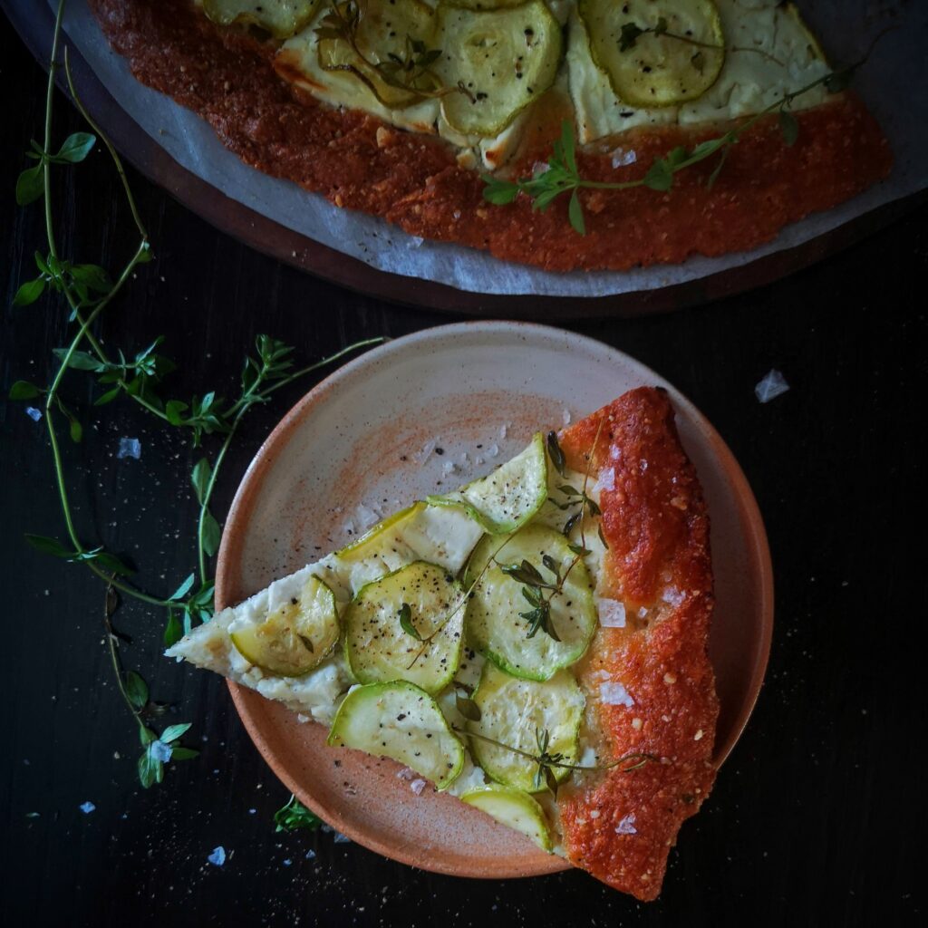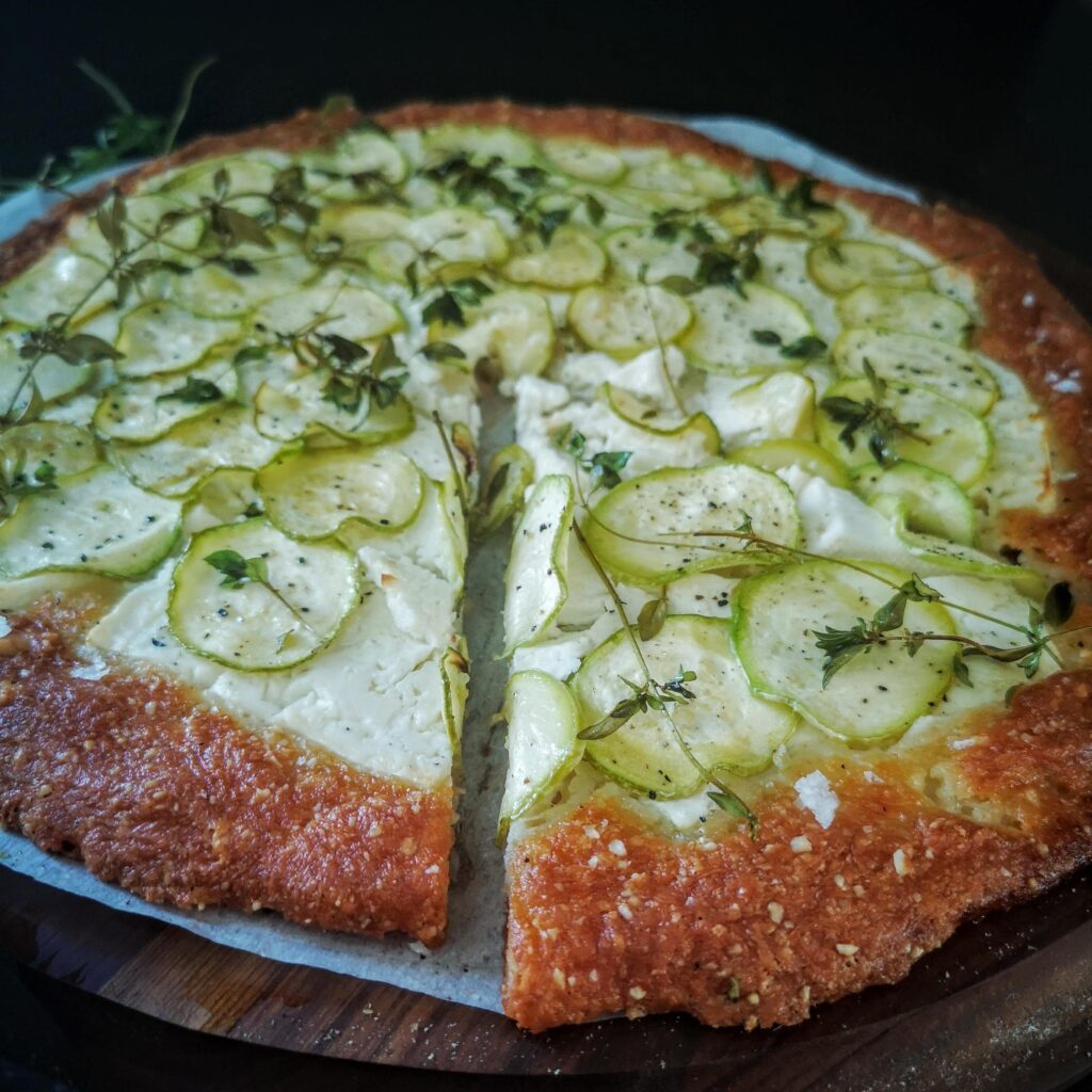 Смесих бадемовото брашно и кашкавала с ръце, без да го разтопявам и после сместа разстлах с помощта на лъжица. Подредих тиквичките върху основата и пекох около 10 минути. Залях със смес от две яйца и 100 гр сирене и пекох до златисто. Върху готовия галет сложих цели листа пресен босилек. Вкусно лято в чиния 🙂 Лека и в същото време питателна храна. Благодаря за вдъхновението!
