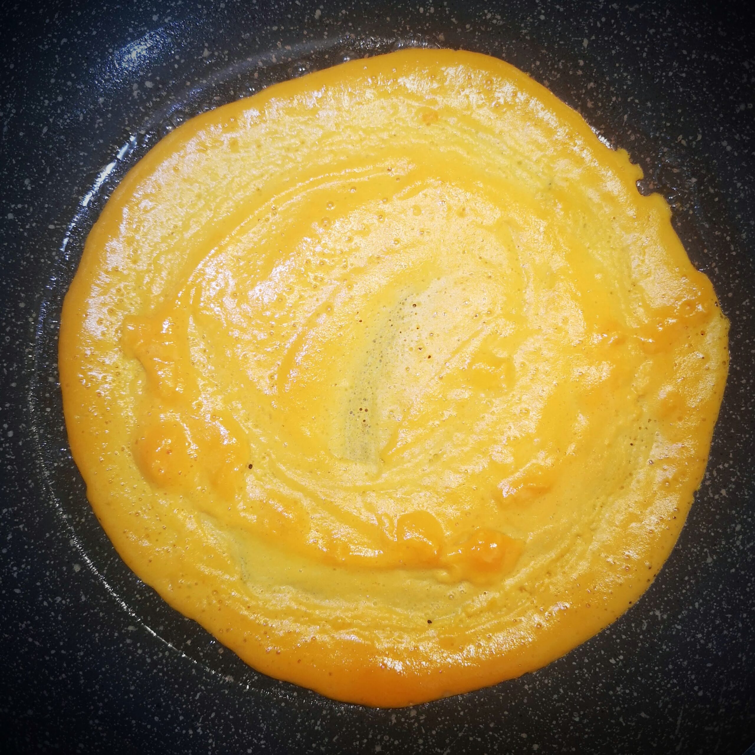 • Загрейте средно голям тиган Ø17-18 см с незалепващо дъно. Намазнете скромно с мазнина. Излейте 1/3 от сместа в тигана и загладете. Печете точно по 1 минута от страна.