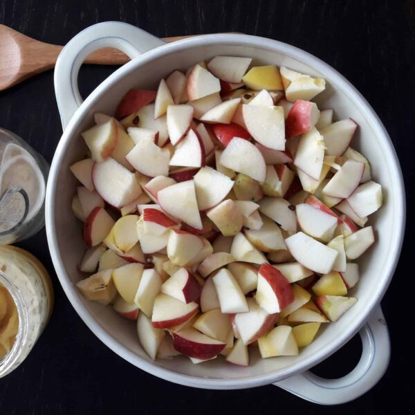 Подгответе ябълките като ги измиете старателно. Прецизно отмерване на количеството не е необходимо. Почистете плодовете. Нарежете ги на кубчета, но без да отстранявате сърцевината. Премахнете само семките (без да сте прецизни) и опашките.