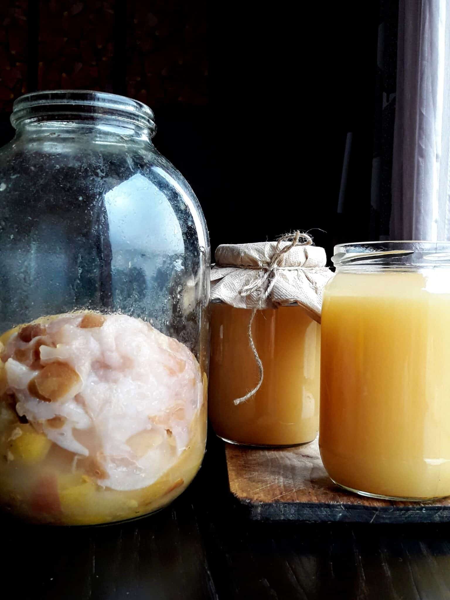 Имам въпрос по т.2 – прехвърлянето за втора ферментация. Само течността с гъбата (ако има) ли слагаме в чисти съдове или също добавяме и изстисканите „ябълки“?
