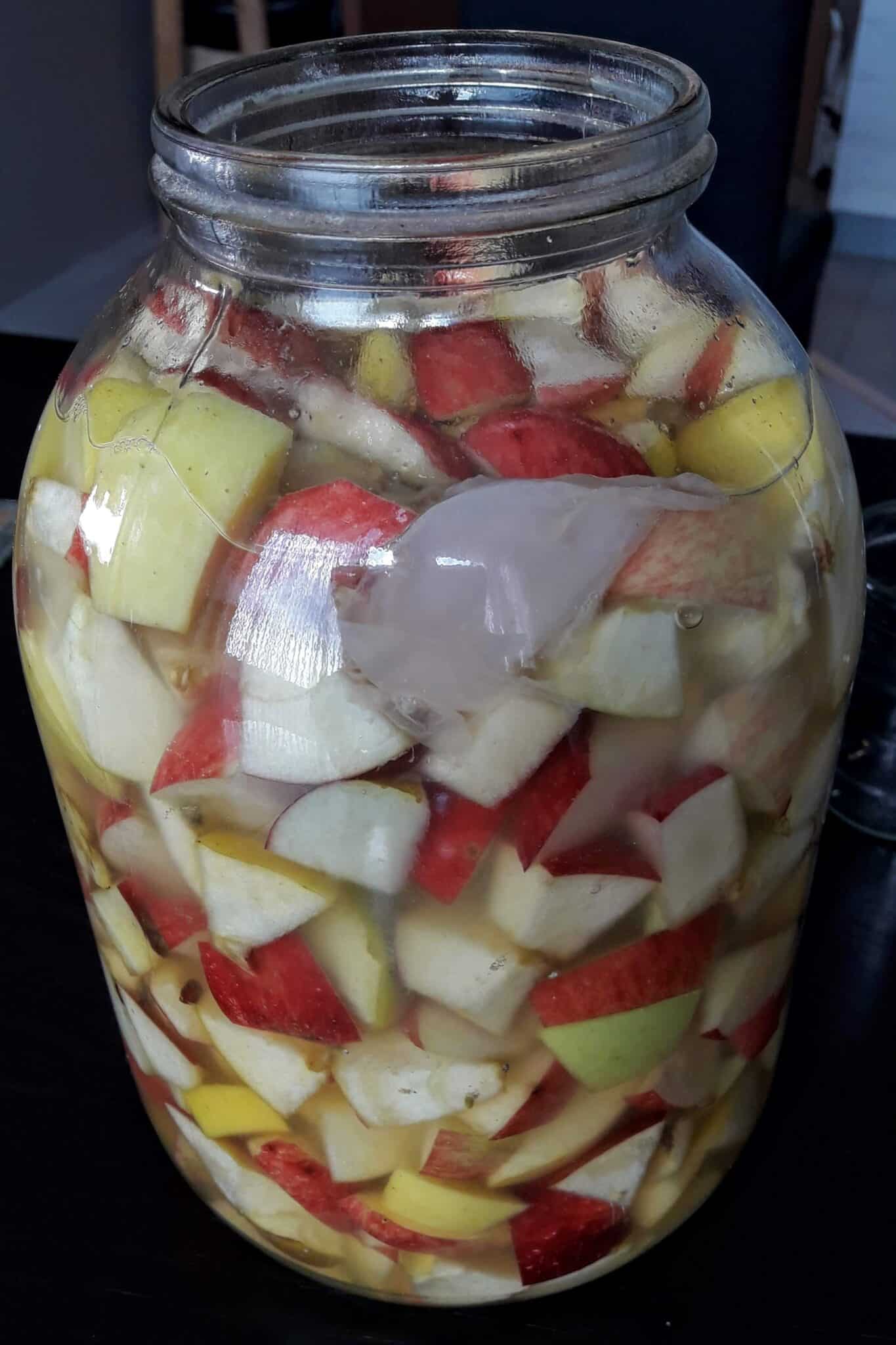 Залейте ябълките с подсладената вода, така, че да бъдат покрити. Покрийте с тензух, тънка тъкан, салфетка, хартия за печене или филтър за кафе. Поставете на топло място за около 3 седмици без пряко слънчево огряване. Миризмата по време на ферментация ще бъде много приятна, лека и плодова. Обърквайте през няколко дни с дървена лъжица.