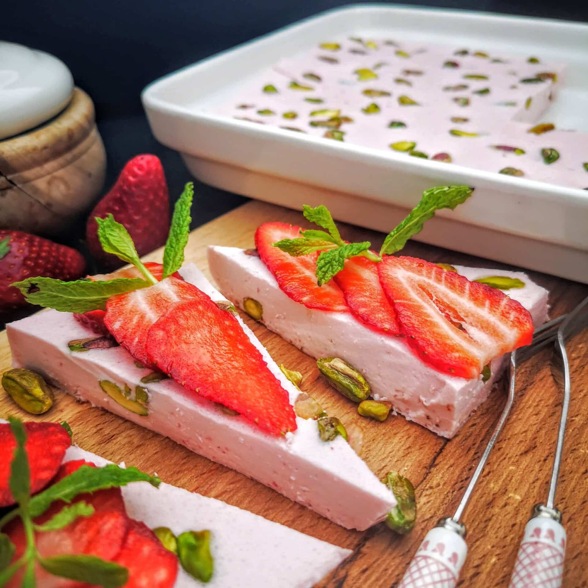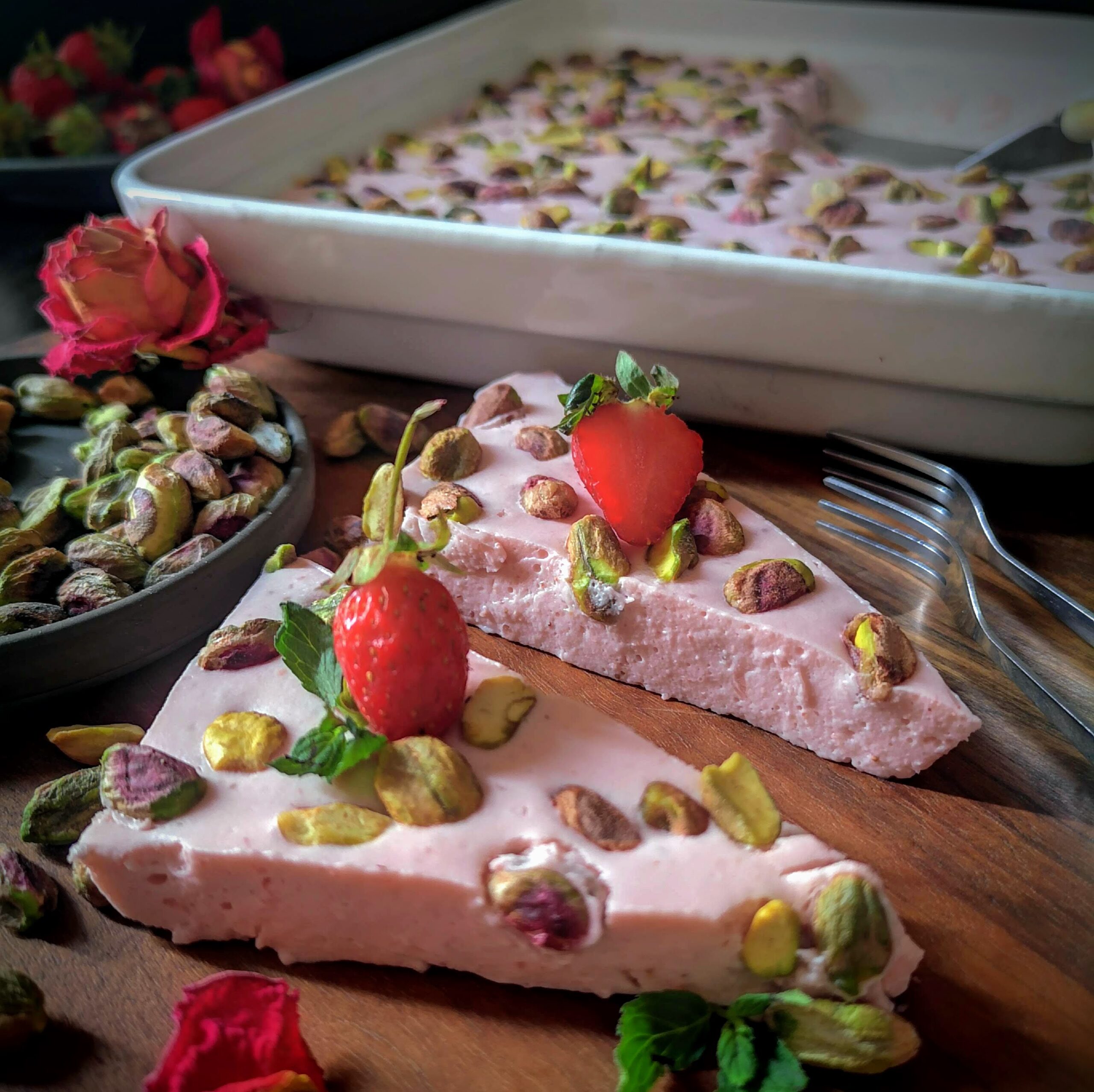 Лек и деликатен десерт с ягоди, шам фъстък и розова вода.
